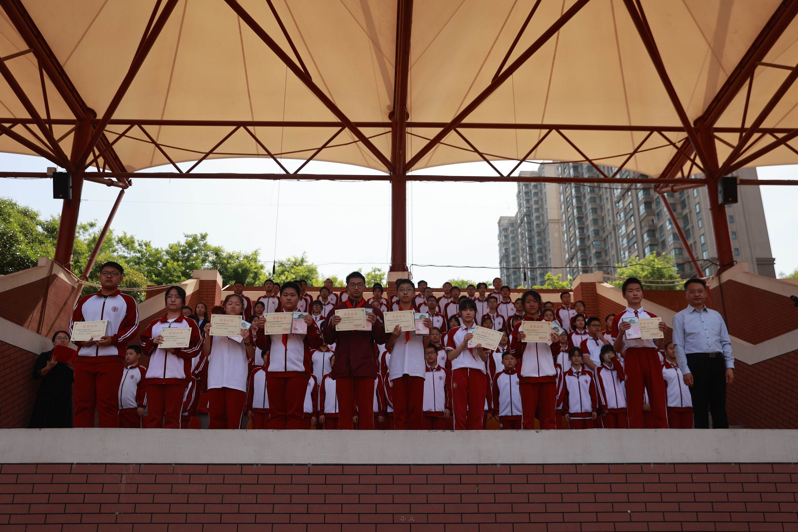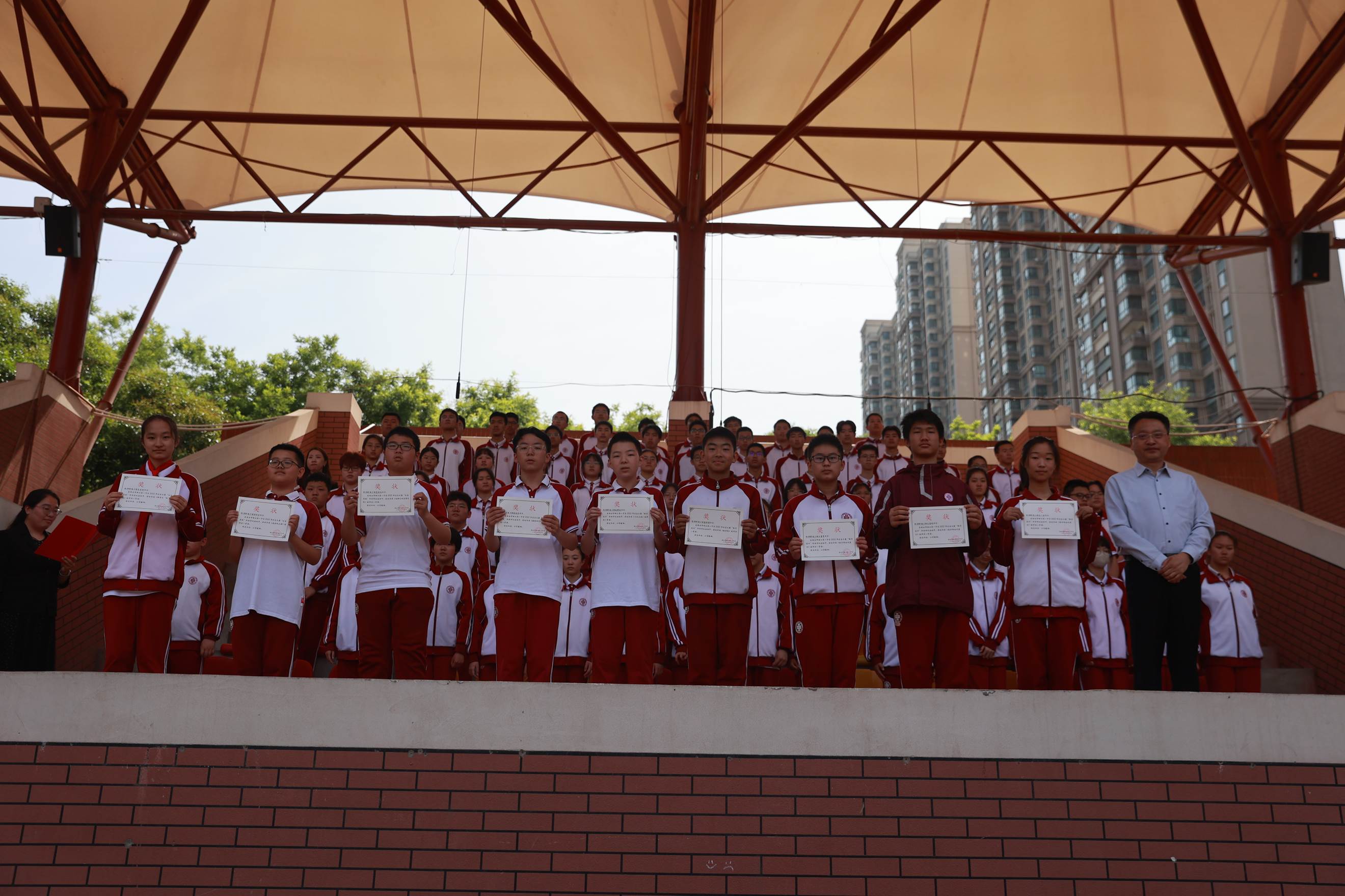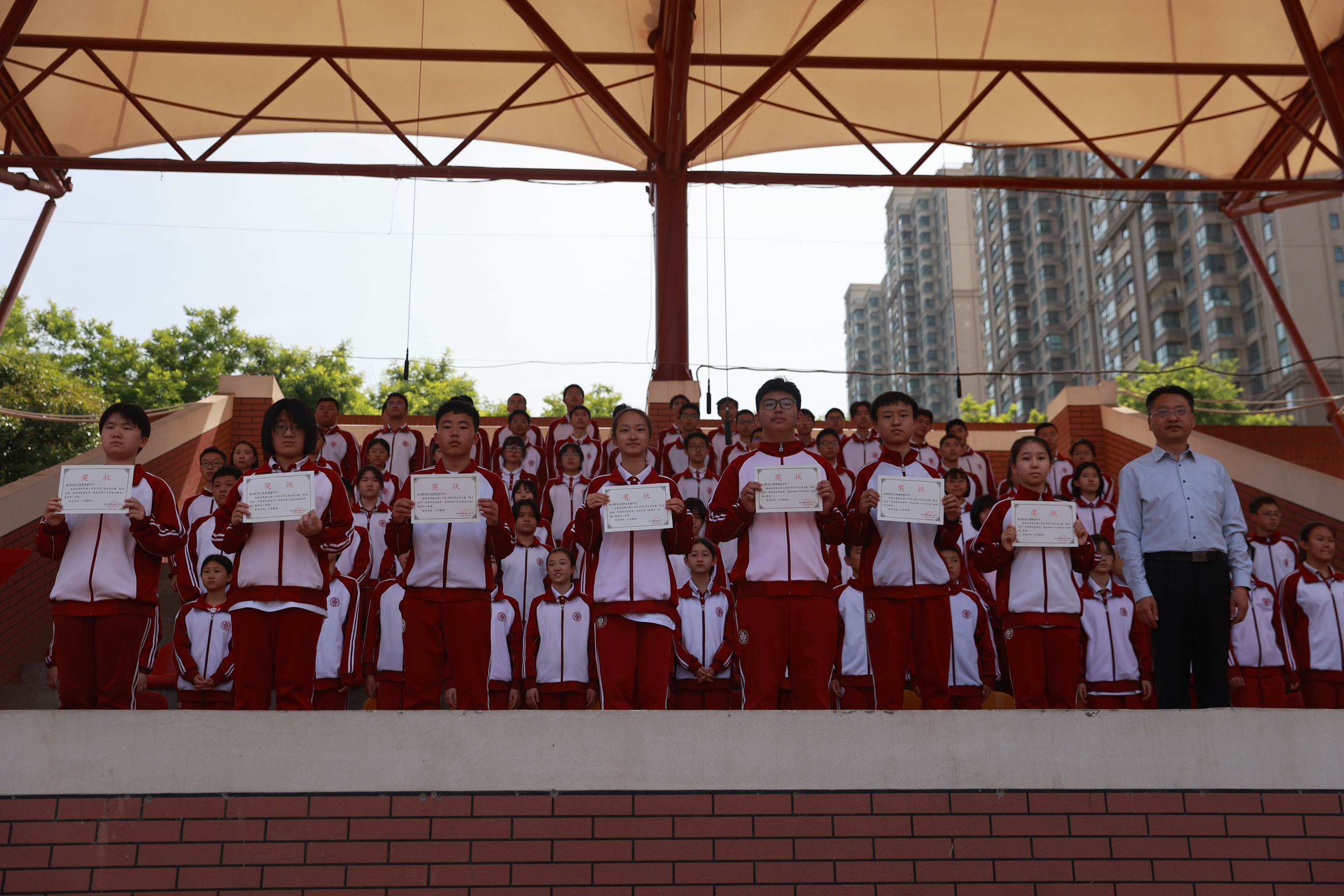 第三项初2021级20班殷若芾、初2020级22班王一帆同学做一分钟英语演讲;第四项宣读第十四周获得“日常行为规范优秀班级”结果;第五项宣读获奖消息,校长陈勇刚为获奖学生颁发荣誉证书并合影。最后由高2021级4班吴骆宾、唐诗雅,初2020级4班王婉嘉、李兆熙同学领诵经典诵读文本《阿房宫赋》第四段和曲江一中校训,嘹亮的诵读声响彻操场,豪迈的气势振奋人心。