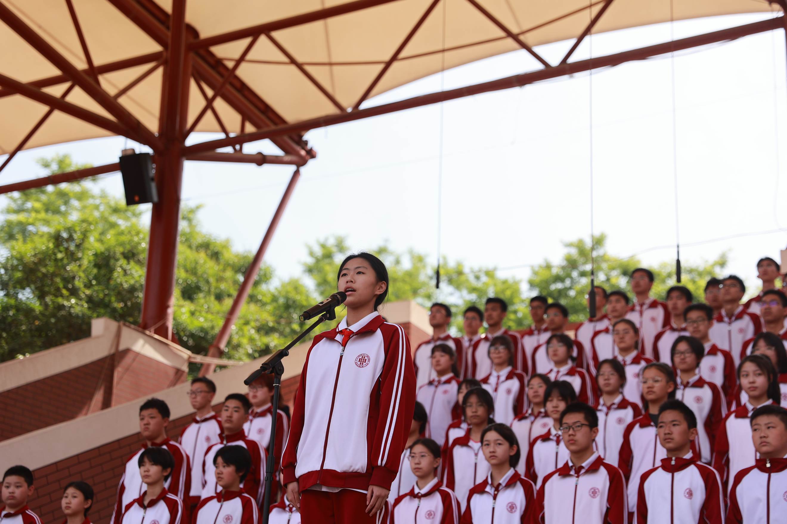 上午10时,升旗仪式正式开始。第一项是升国旗、奏唱国歌。东、西区分别领唱国歌的是曲江一中合唱团、高2021级4班和初2020级4班同学,伴随着雄壮激昂的《义勇军进行曲》,鲜艳的五星红旗冉冉升起,飘扬在曲江一中上空,全体师生庄严肃立面向国旗行注目礼,共唱国歌。
