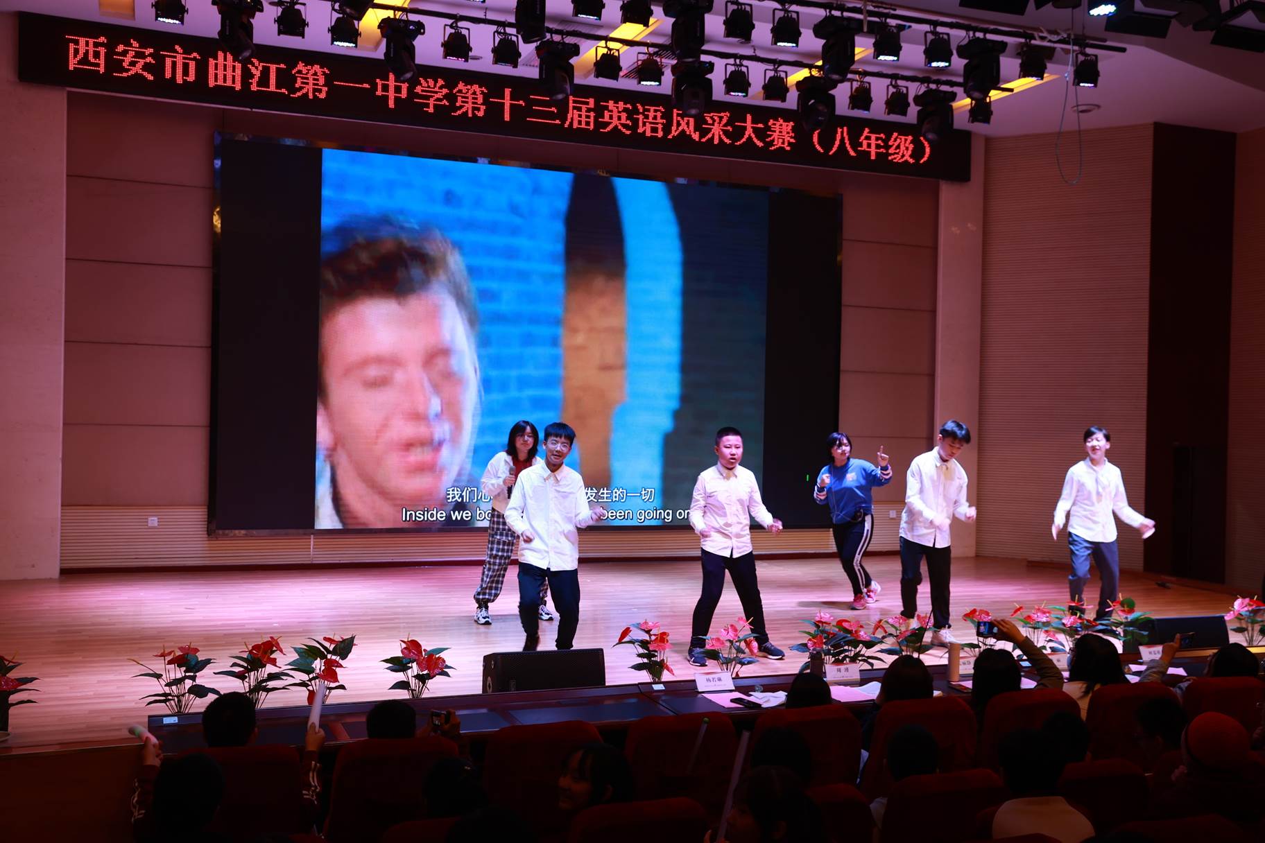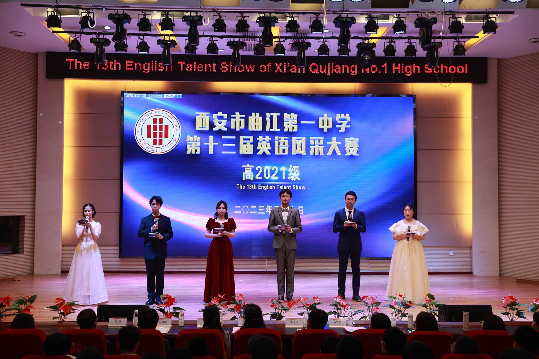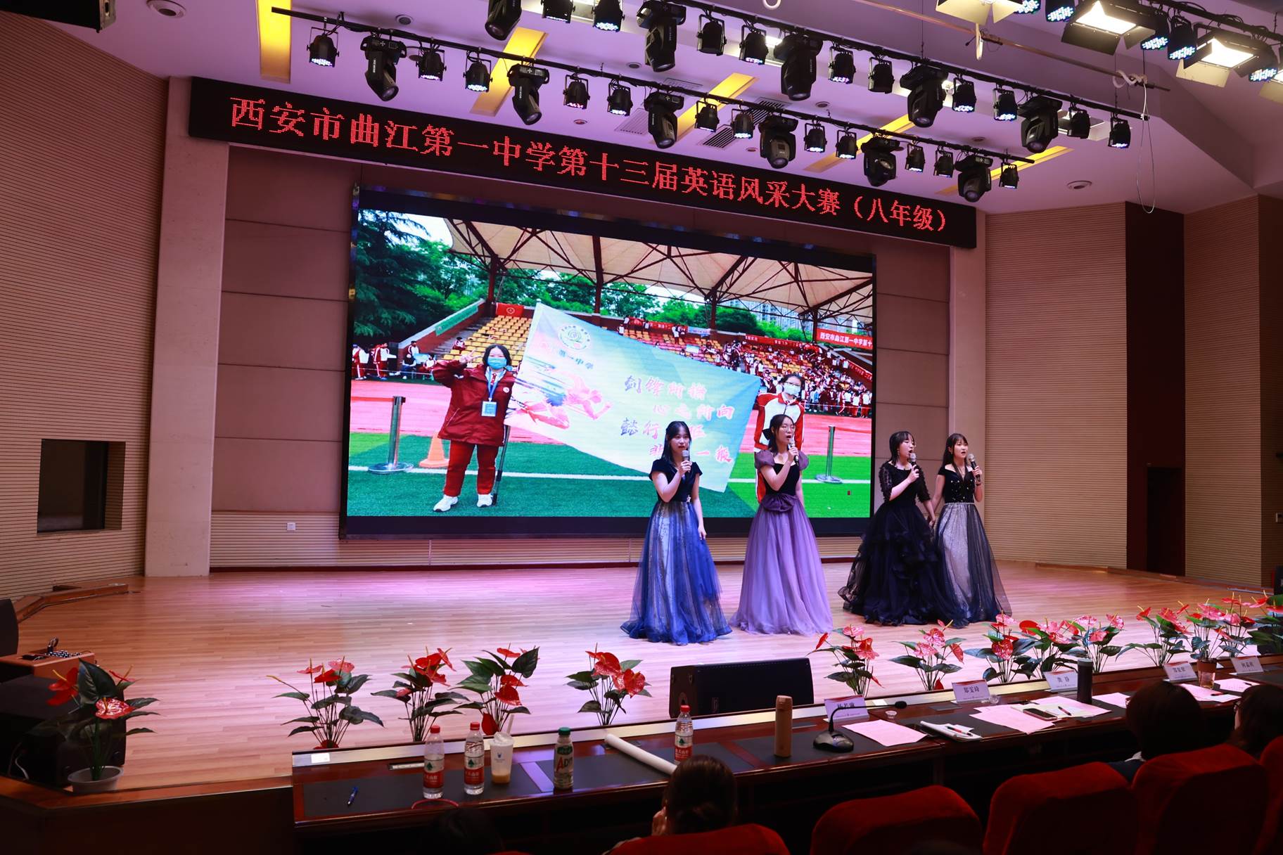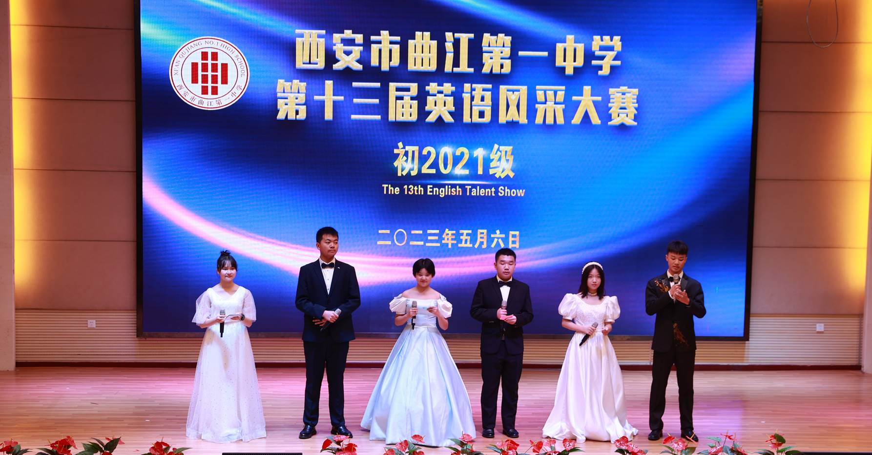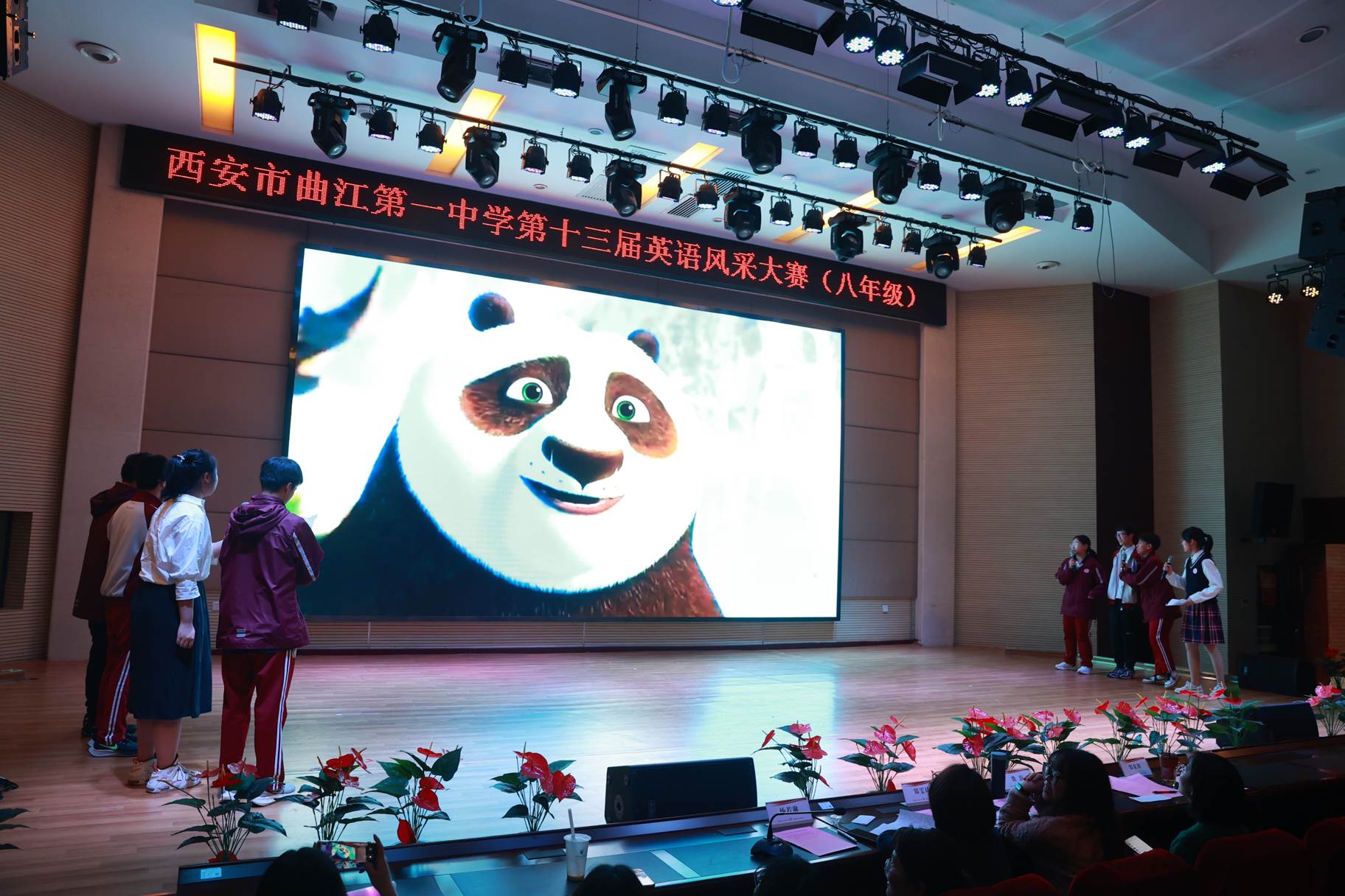 “SHOW”出青春、“英”你精彩。绚烂多彩的五月,西安市曲江第一中学第十三届英语风采大赛在学校润德厅拉开序幕。5月10日,曲江一中第十三届英语风采大赛(高2021级组)在润德厅举行,校长陈勇刚、政教处副主任董锋、丁慧芸出席活动,英语教研组王文涛、郭妍玲、唐炳儒等老师担任评委。大赛分为个人演讲、心有灵犀、电影配音、英文歌曲演唱、创意风采秀五个环节。在个人演讲环节,参赛选手以流利的口语、标准的发音、自如的演绎深深吸引了观众,抑扬顿挫的演讲、激扬铿锵的语调演绎出对“理想”与“信念”的感悟;电影配音环节别开生面,让所有观众一同沉浸《疯狂动物城》的欢笑与感动,感受《四色战记》的团结与勇气、赞叹《青春变形记》的智慧与担当;英文歌曲演唱环节加入舞台剧、歌舞秀等形式,无不让大家感叹曲一学子的才华和风采。