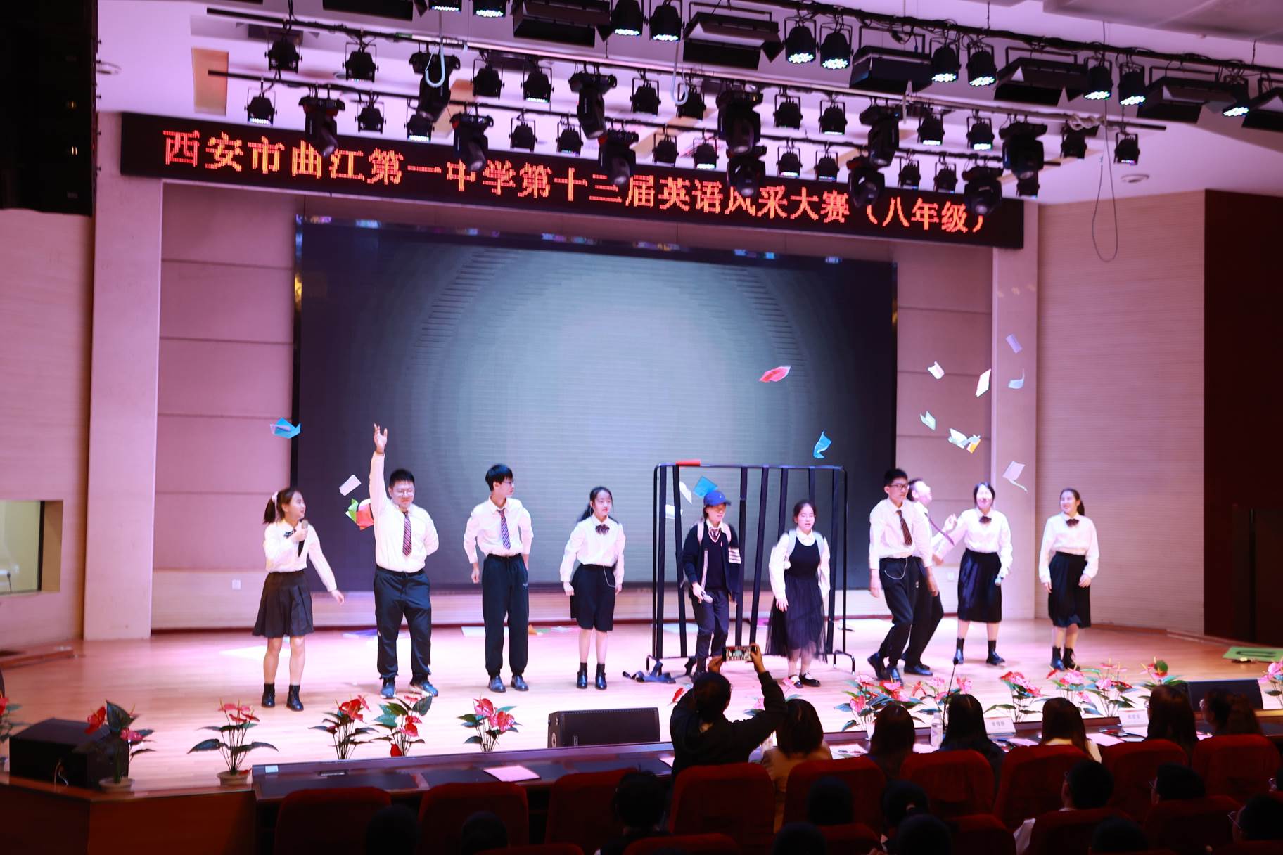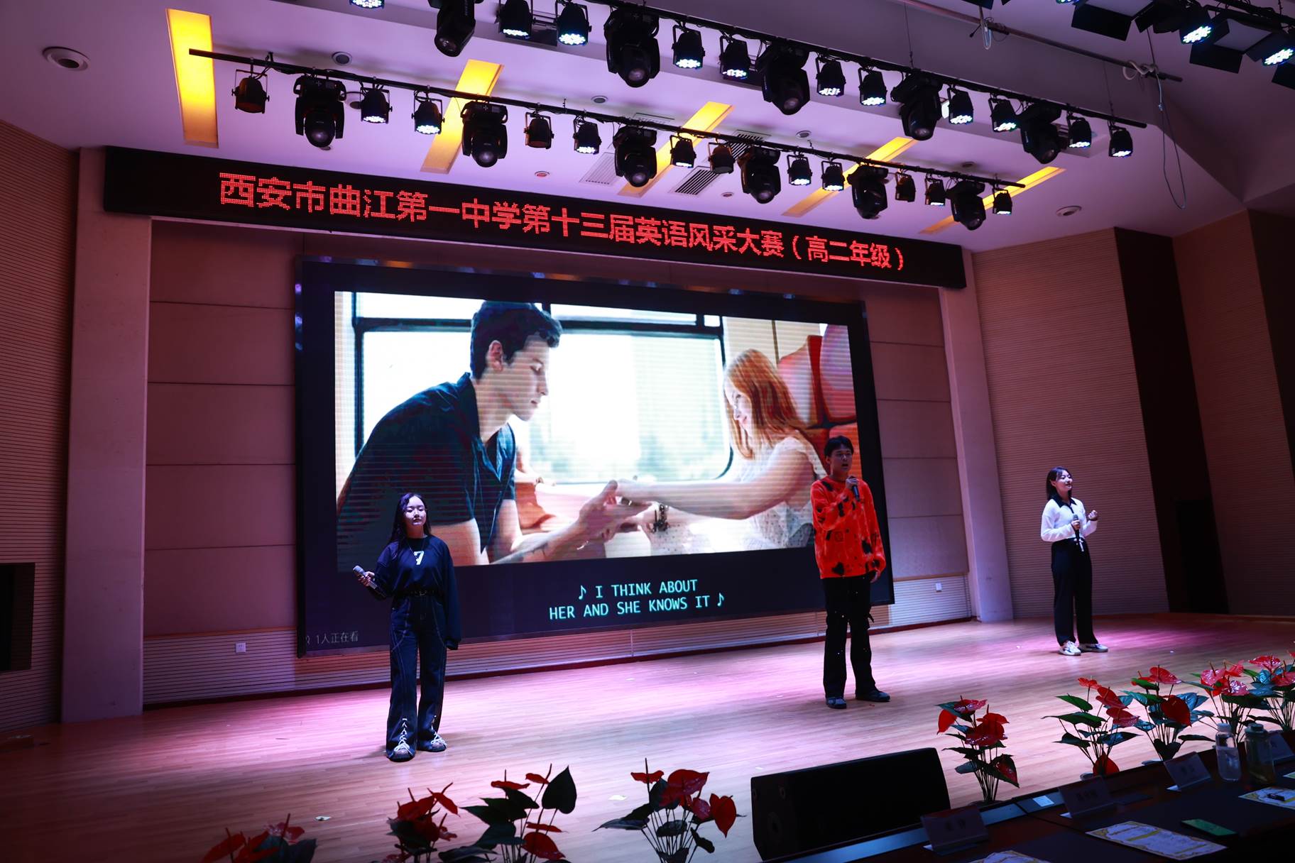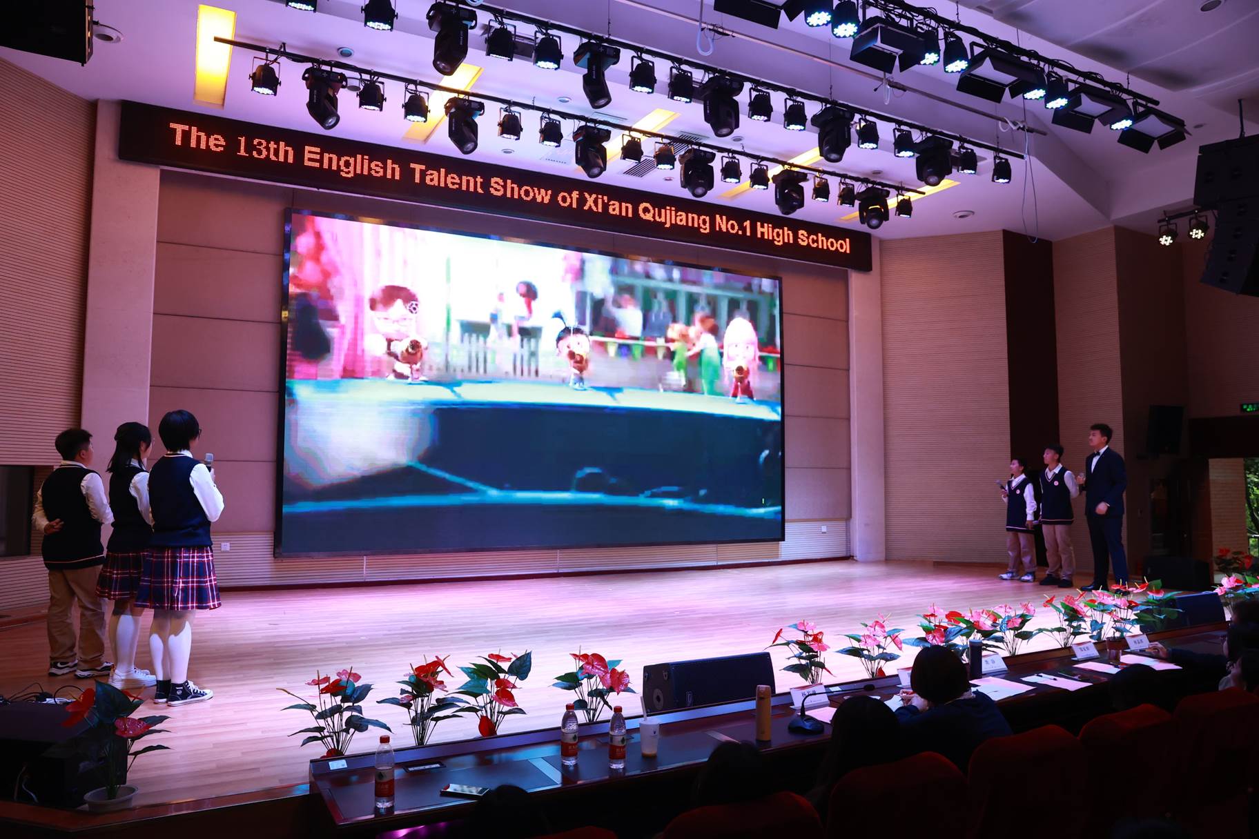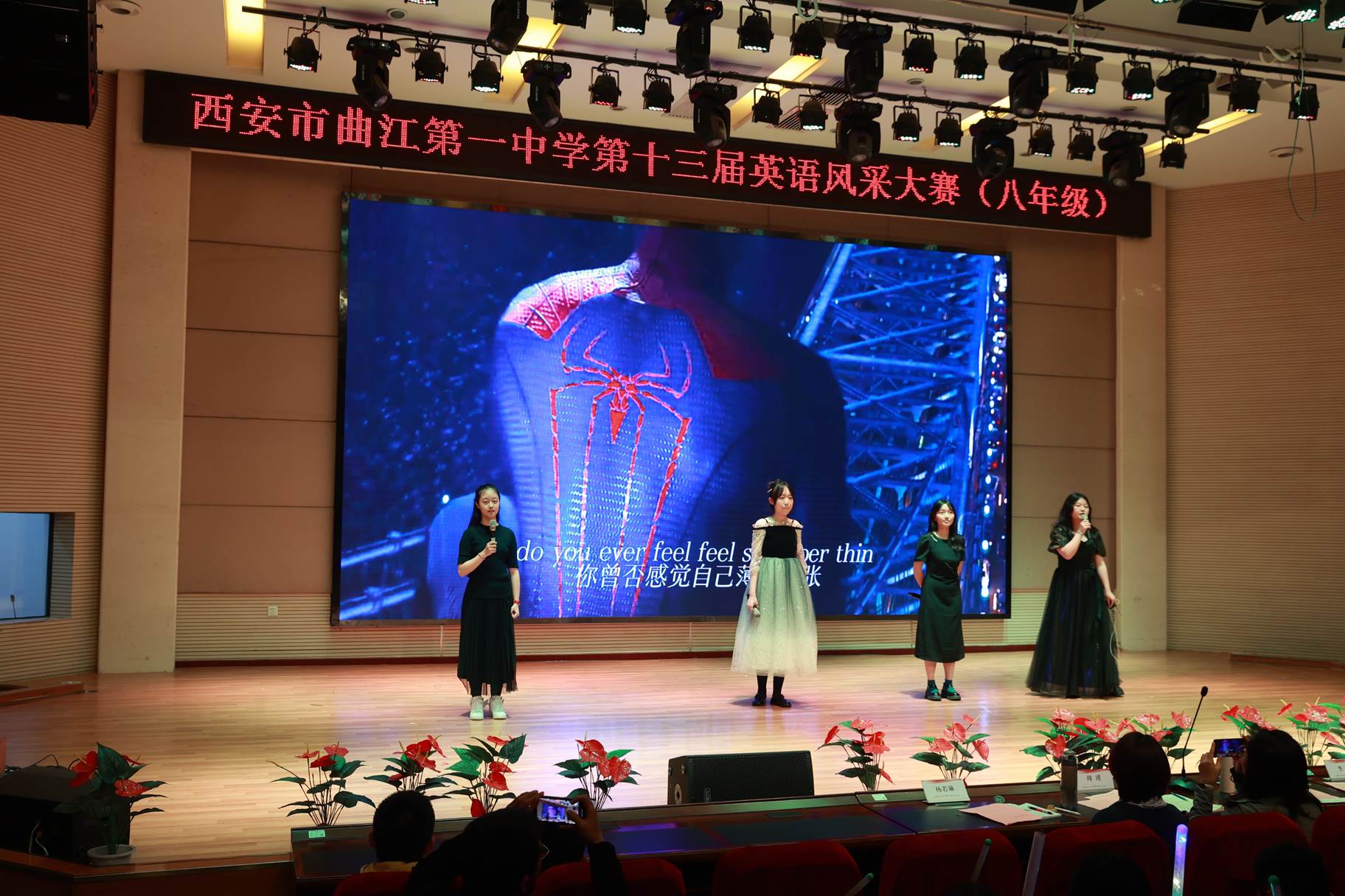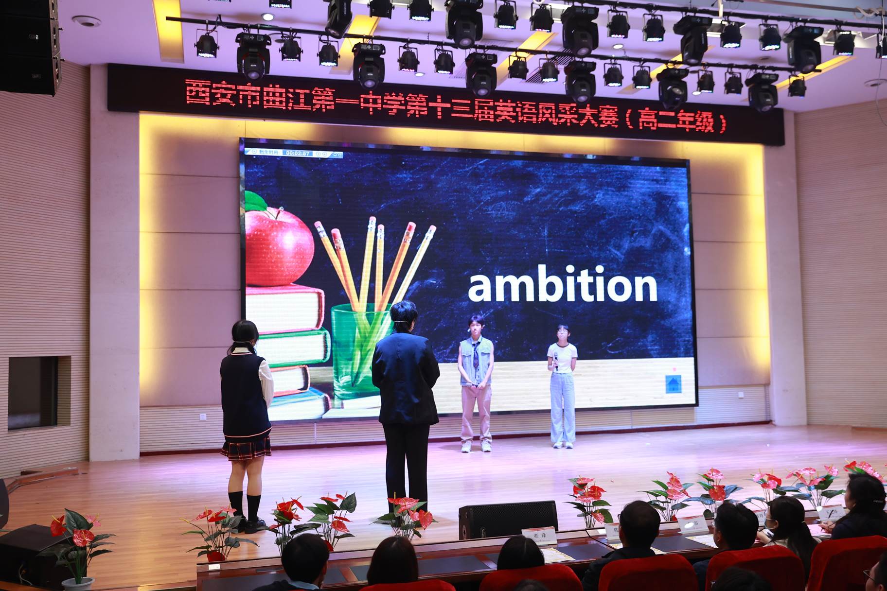 “SHOW”出青春、“英”你精彩。绚烂多彩的五月,西安市曲江第一中学第十三届英语风采大赛在学校润德厅拉开序幕。5月10日,曲江一中第十三届英语风采大赛(高2021级组)在润德厅举行,校长陈勇刚、政教处副主任董锋、丁慧芸出席活动,英语教研组王文涛、郭妍玲、唐炳儒等老师担任评委。大赛分为个人演讲、心有灵犀、电影配音、英文歌曲演唱、创意风采秀五个环节。在个人演讲环节,参赛选手以流利的口语、标准的发音、自如的演绎深深吸引了观众,抑扬顿挫的演讲、激扬铿锵的语调演绎出对“理想”与“信念”的感悟;电影配音环节别开生面,让所有观众一同沉浸《疯狂动物城》的欢笑与感动,感受《四色战记》的团结与勇气、赞叹《青春变形记》的智慧与担当;英文歌曲演唱环节加入舞台剧、歌舞秀等形式,无不让大家感叹曲一学子的才华和风采。