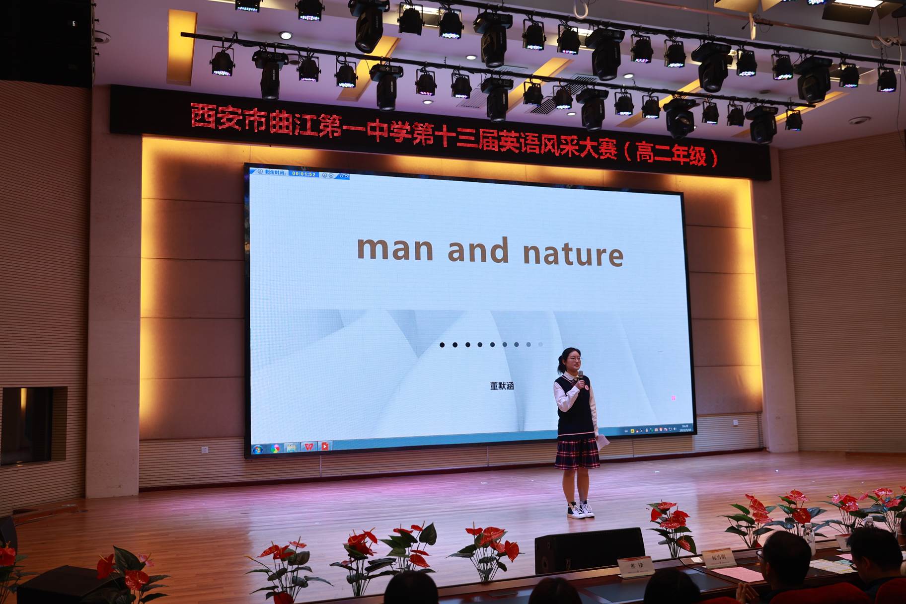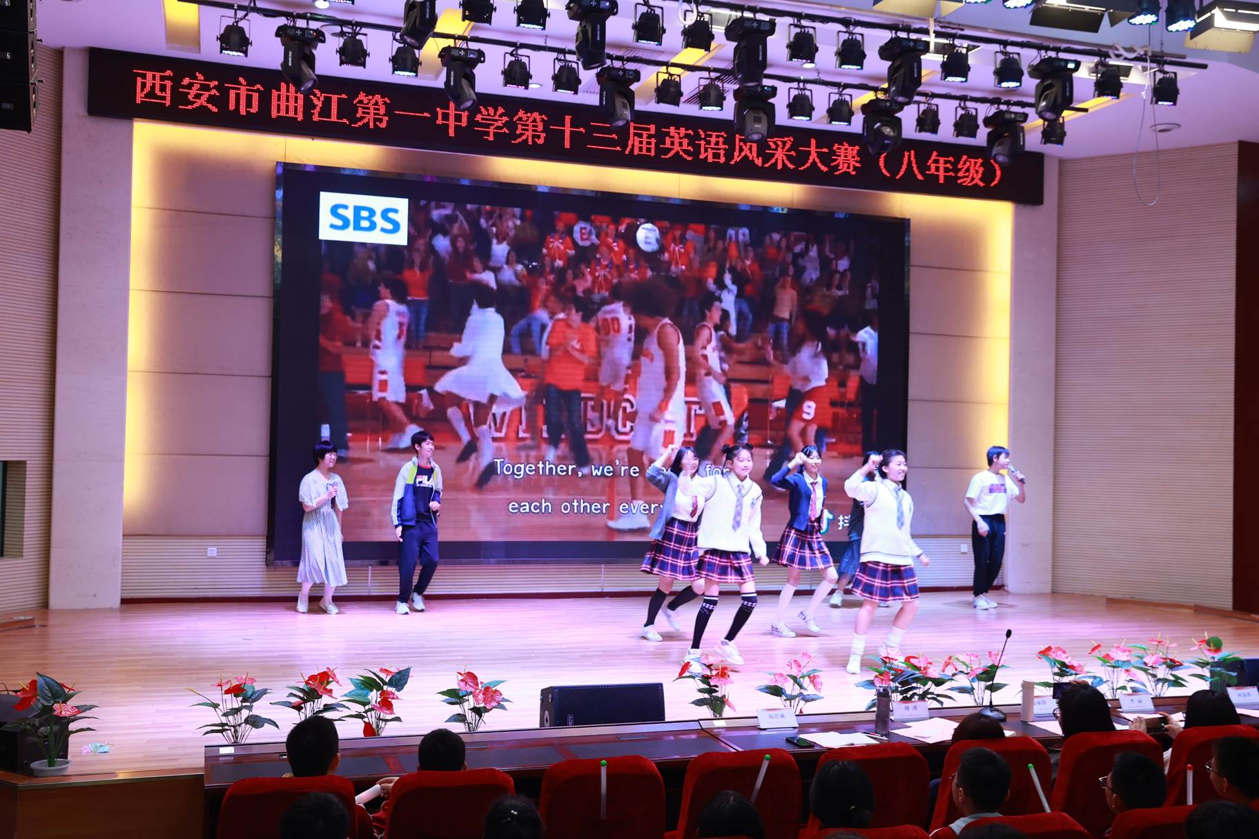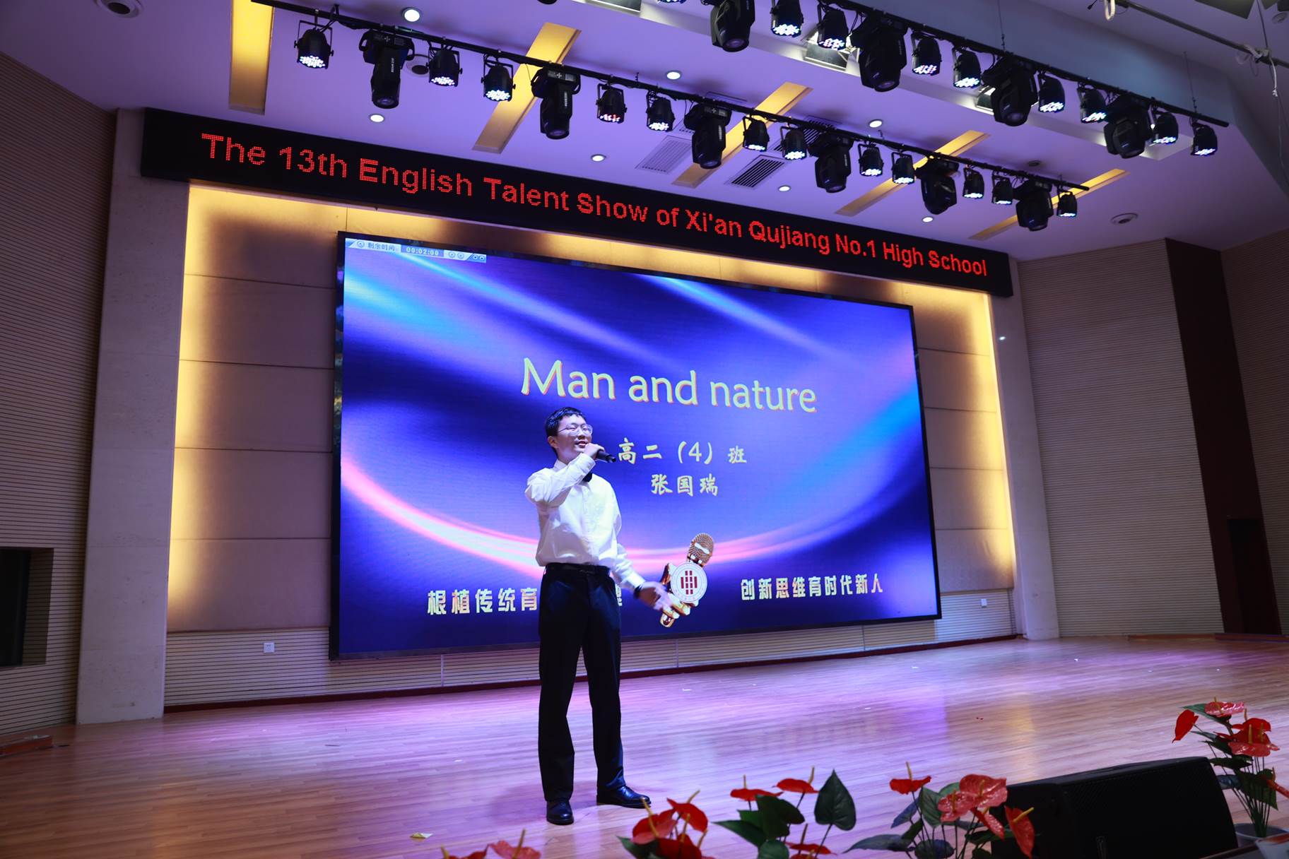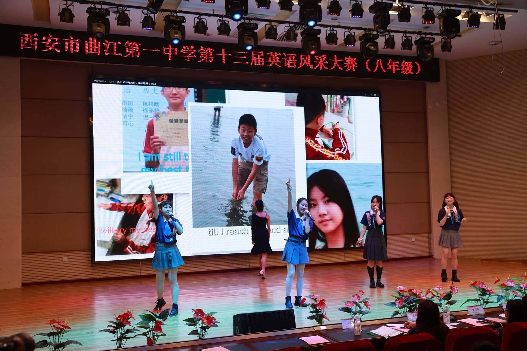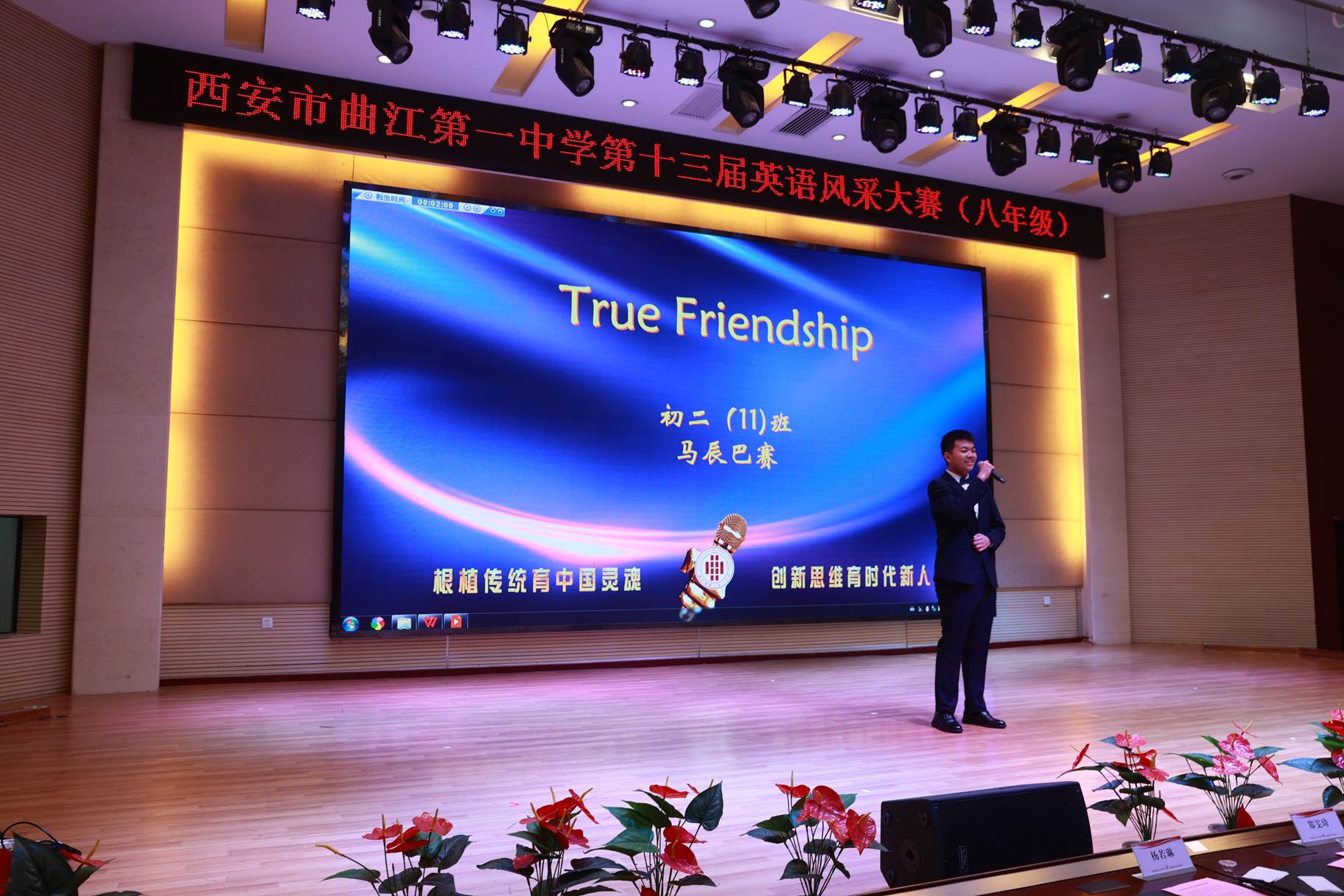 “SHOW”出青春、“英”你精彩。绚烂多彩的五月,西安市曲江第一中学第十三届英语风采大赛在学校润德厅拉开序幕。5月10日,曲江一中第十三届英语风采大赛(高2021级组)在润德厅举行,校长陈勇刚、政教处副主任董锋、丁慧芸出席活动,英语教研组王文涛、郭妍玲、唐炳儒等老师担任评委。大赛分为个人演讲、心有灵犀、电影配音、英文歌曲演唱、创意风采秀五个环节。在个人演讲环节,参赛选手以流利的口语、标准的发音、自如的演绎深深吸引了观众,抑扬顿挫的演讲、激扬铿锵的语调演绎出对“理想”与“信念”的感悟;电影配音环节别开生面,让所有观众一同沉浸《疯狂动物城》的欢笑与感动,感受《四色战记》的团结与勇气、赞叹《青春变形记》的智慧与担当;英文歌曲演唱环节加入舞台剧、歌舞秀等形式,无不让大家感叹曲一学子的才华和风采。