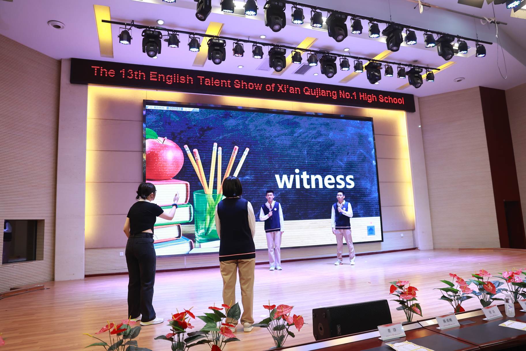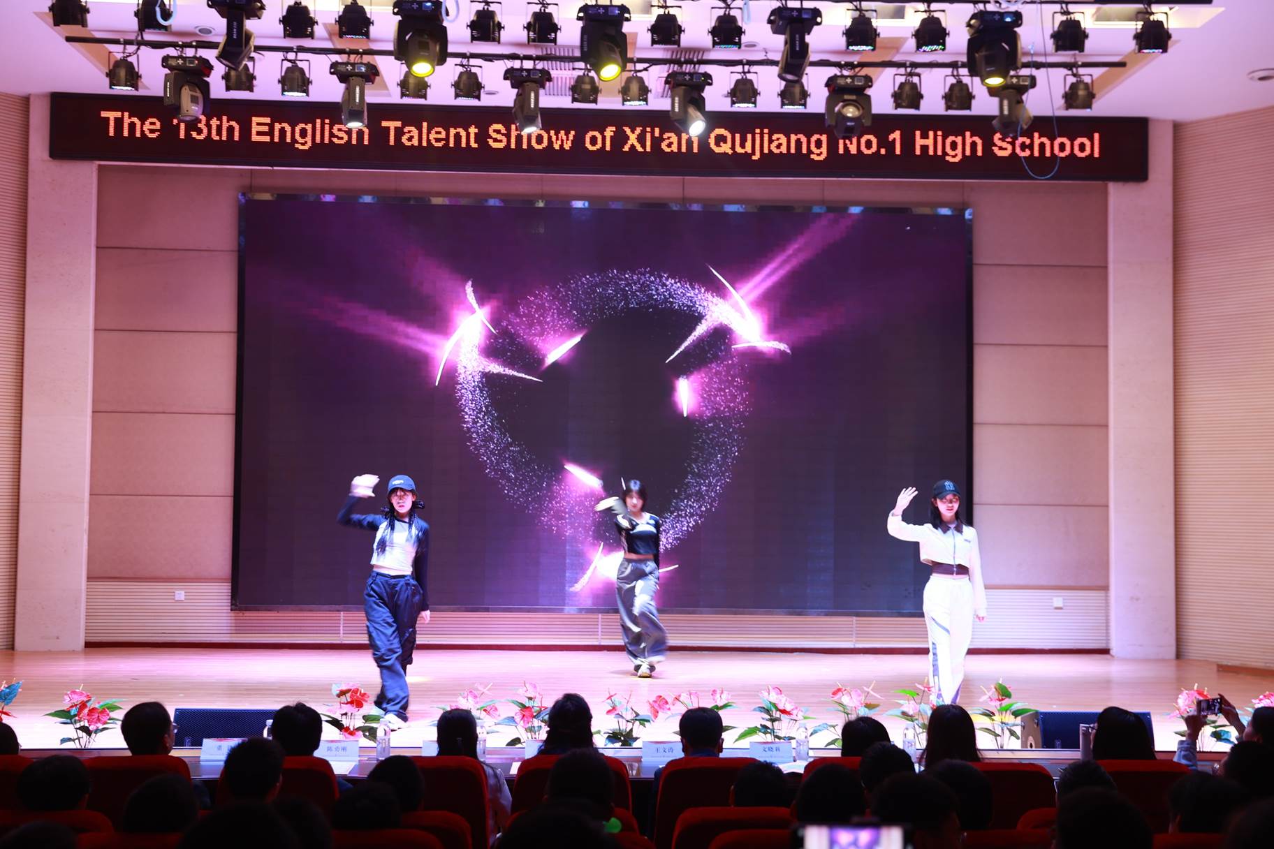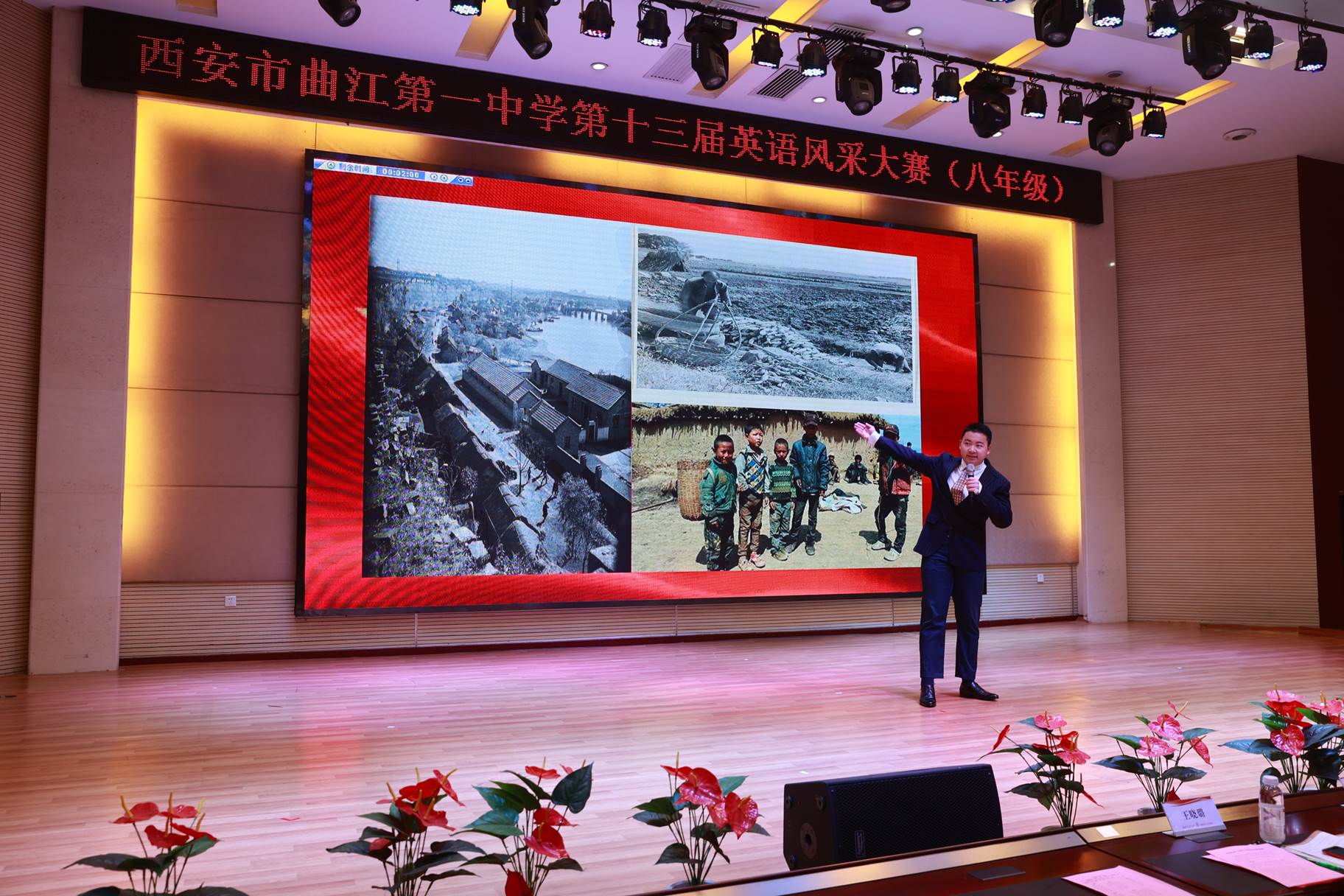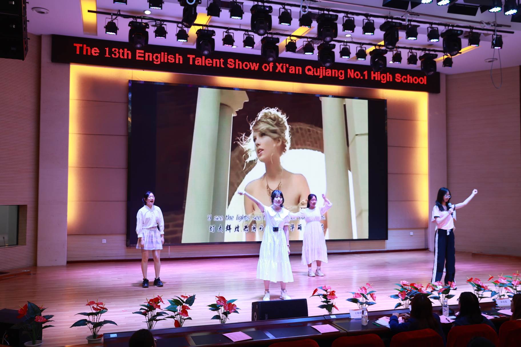 “SHOW”出青春、“英”你精彩。绚烂多彩的五月,西安市曲江第一中学第十三届英语风采大赛在学校润德厅拉开序幕。5月10日,曲江一中第十三届英语风采大赛(高2021级组)在润德厅举行,校长陈勇刚、政教处副主任董锋、丁慧芸出席活动,英语教研组王文涛、郭妍玲、唐炳儒等老师担任评委。大赛分为个人演讲、心有灵犀、电影配音、英文歌曲演唱、创意风采秀五个环节。在个人演讲环节,参赛选手以流利的口语、标准的发音、自如的演绎深深吸引了观众,抑扬顿挫的演讲、激扬铿锵的语调演绎出对“理想”与“信念”的感悟;电影配音环节别开生面,让所有观众一同沉浸《疯狂动物城》的欢笑与感动,感受《四色战记》的团结与勇气、赞叹《青春变形记》的智慧与担当;英文歌曲演唱环节加入舞台剧、歌舞秀等形式,无不让大家感叹曲一学子的才华和风采。