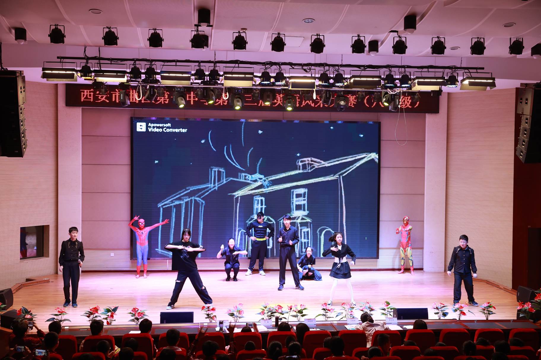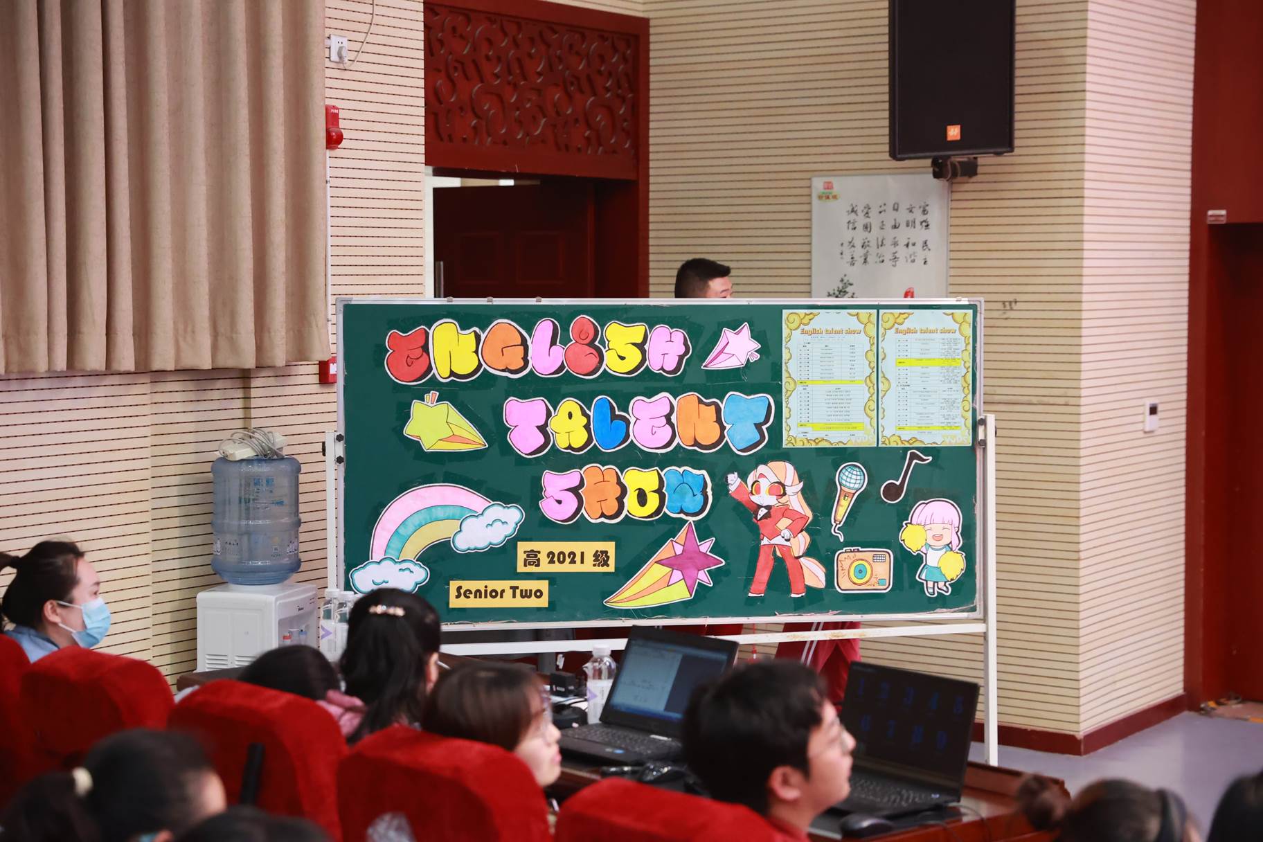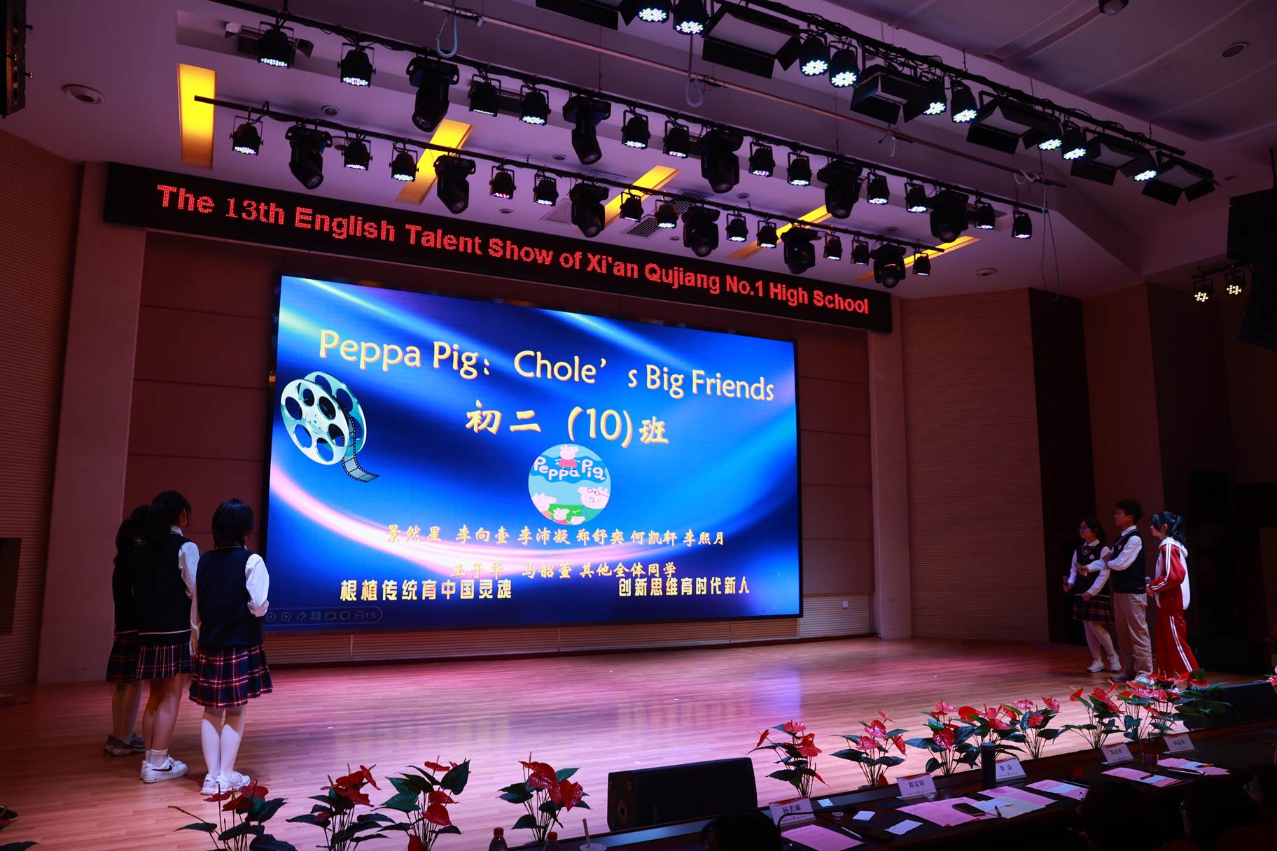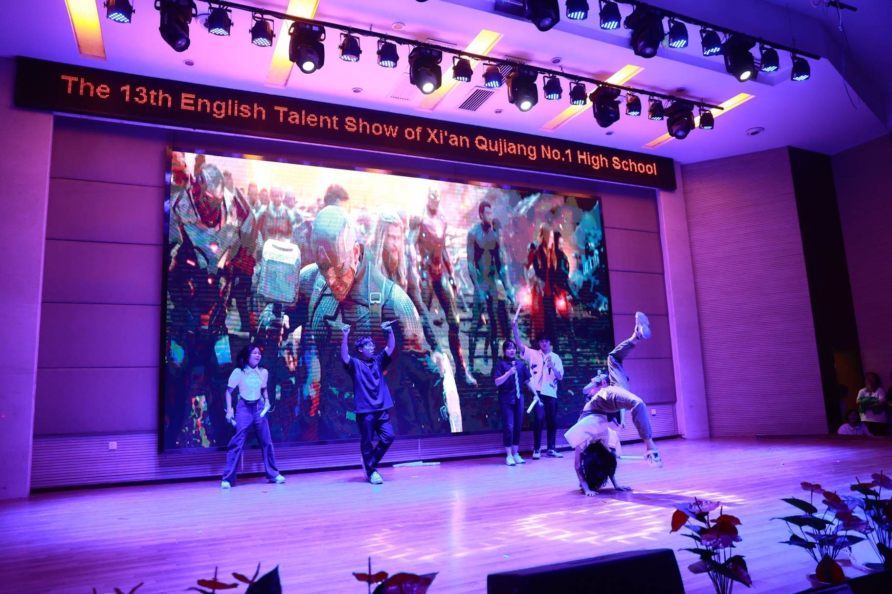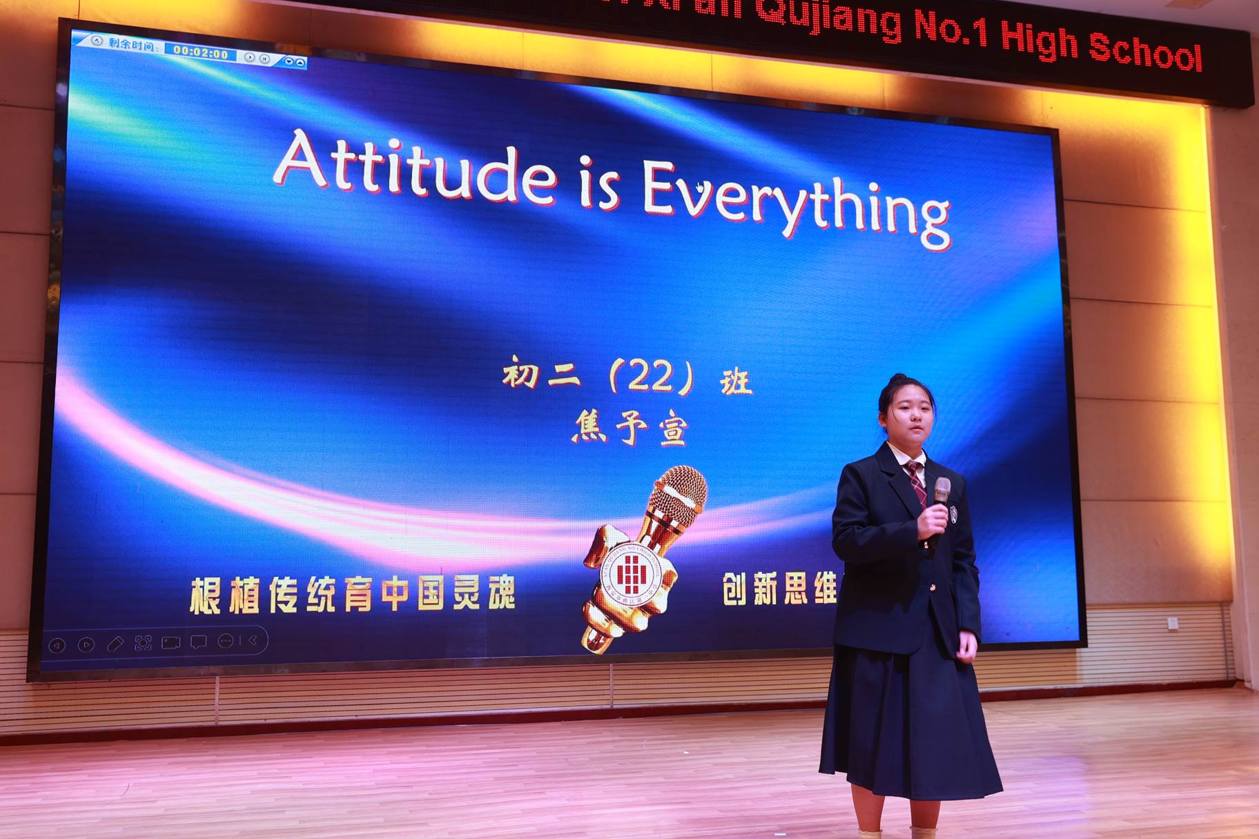 “SHOW”出青春、“英”你精彩。绚烂多彩的五月,西安市曲江第一中学第十三届英语风采大赛在学校润德厅拉开序幕。5月10日,曲江一中第十三届英语风采大赛(高2021级组)在润德厅举行,校长陈勇刚、政教处副主任董锋、丁慧芸出席活动,英语教研组王文涛、郭妍玲、唐炳儒等老师担任评委。大赛分为个人演讲、心有灵犀、电影配音、英文歌曲演唱、创意风采秀五个环节。在个人演讲环节,参赛选手以流利的口语、标准的发音、自如的演绎深深吸引了观众,抑扬顿挫的演讲、激扬铿锵的语调演绎出对“理想”与“信念”的感悟;电影配音环节别开生面,让所有观众一同沉浸《疯狂动物城》的欢笑与感动,感受《四色战记》的团结与勇气、赞叹《青春变形记》的智慧与担当;英文歌曲演唱环节加入舞台剧、歌舞秀等形式,无不让大家感叹曲一学子的才华和风采。