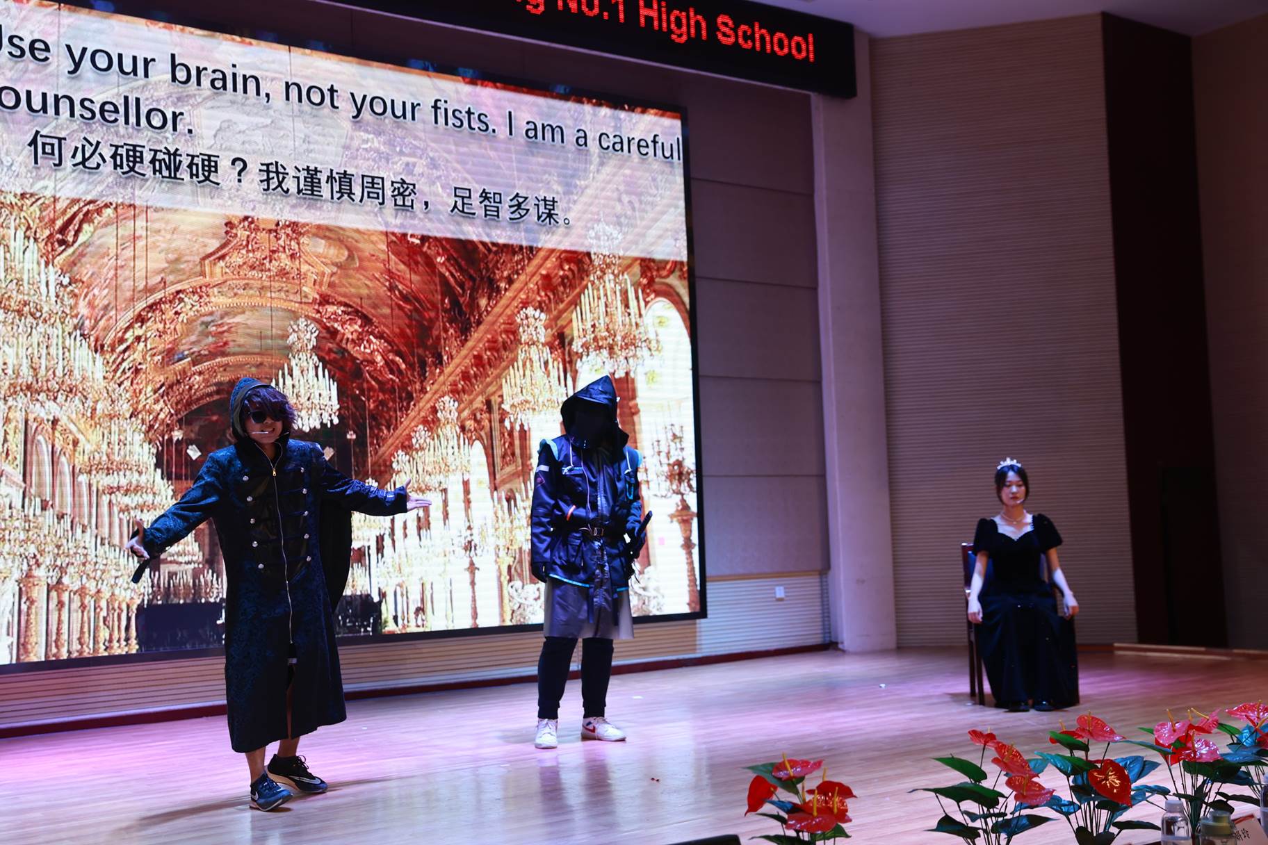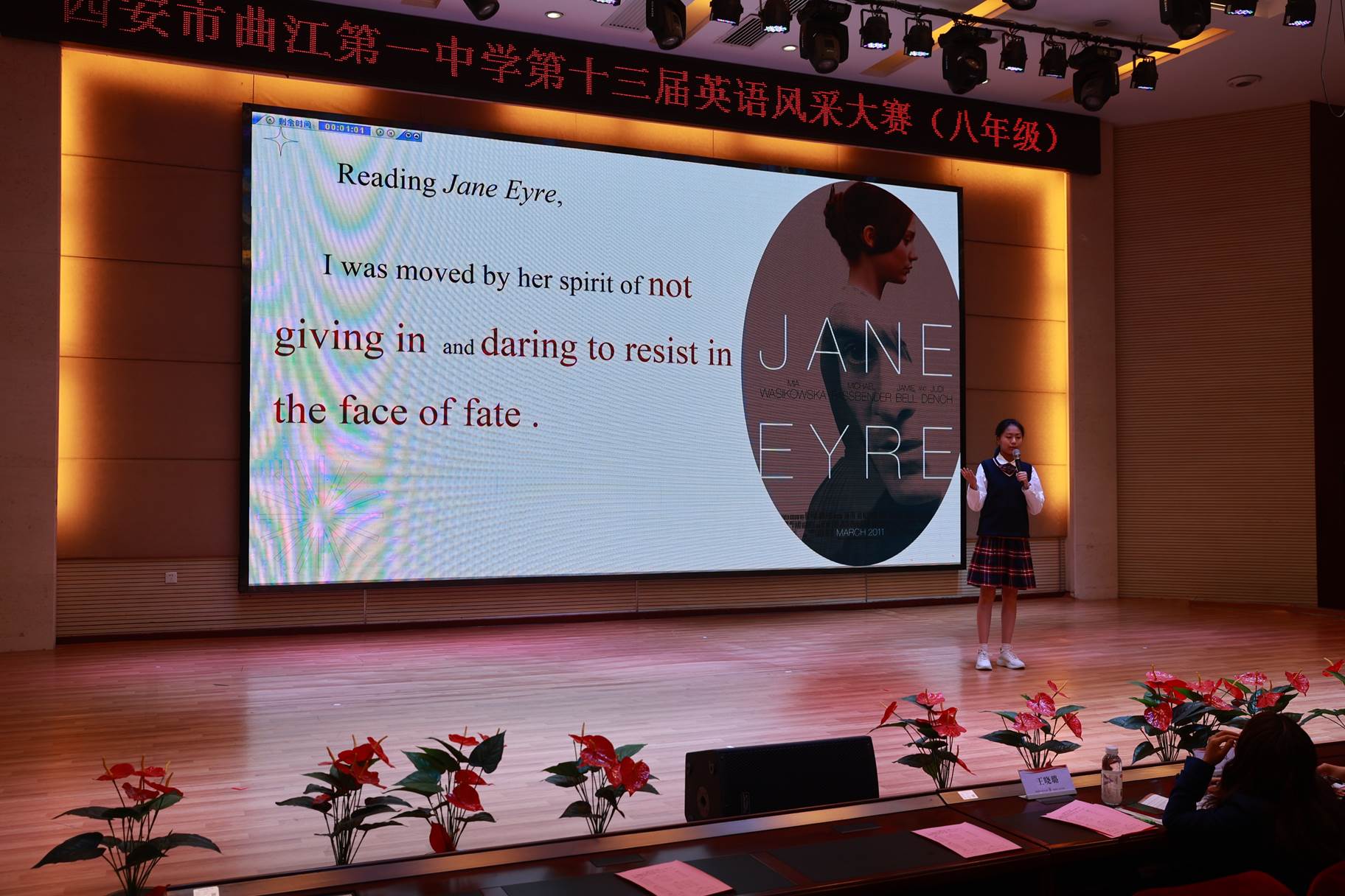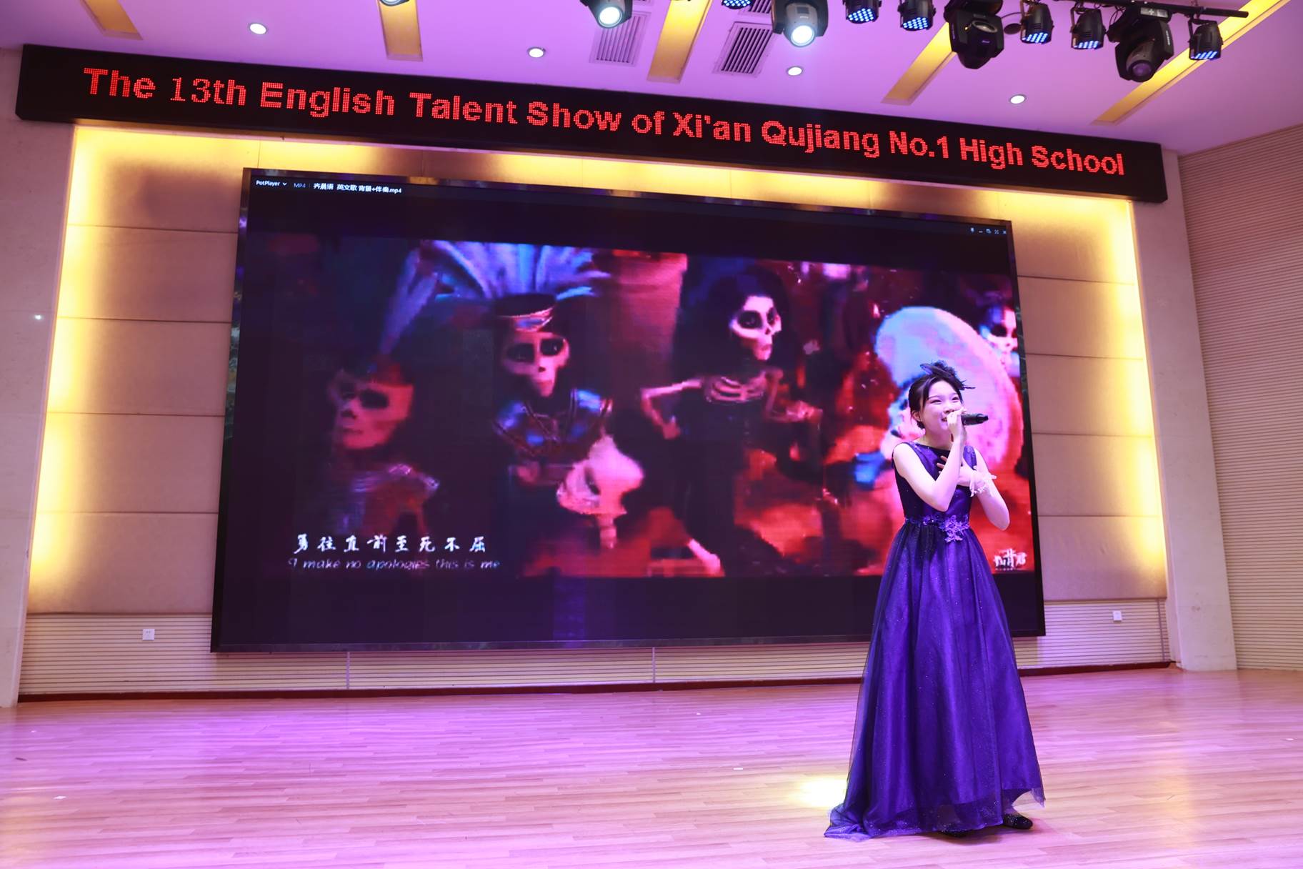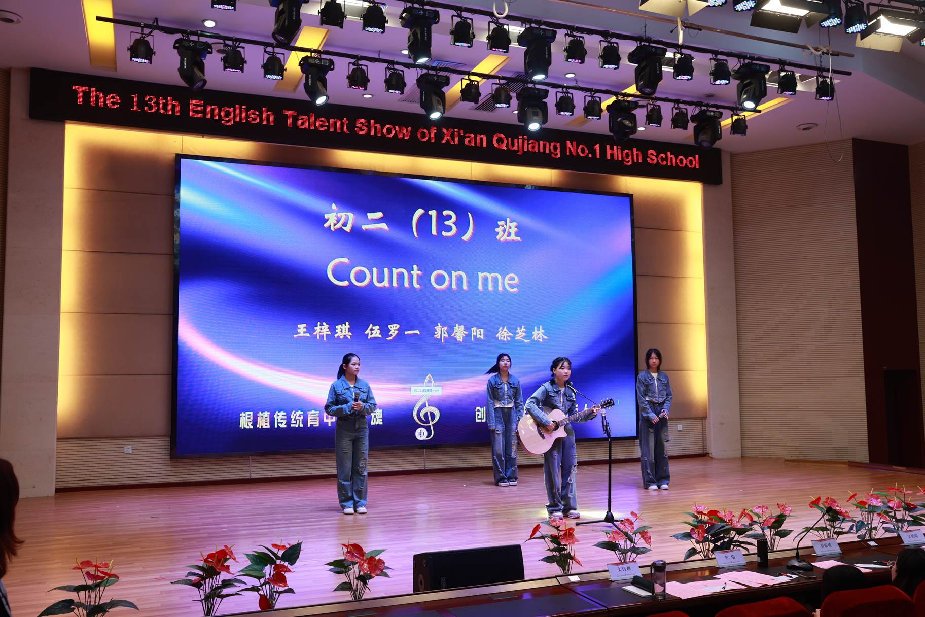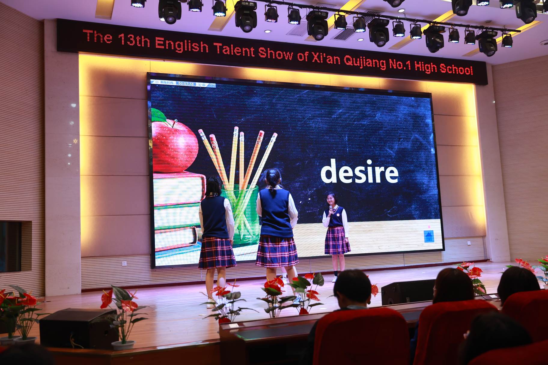 “SHOW”出青春、“英”你精彩。绚烂多彩的五月,西安市曲江第一中学第十三届英语风采大赛在学校润德厅拉开序幕。5月10日,曲江一中第十三届英语风采大赛(高2021级组)在润德厅举行,校长陈勇刚、政教处副主任董锋、丁慧芸出席活动,英语教研组王文涛、郭妍玲、唐炳儒等老师担任评委。大赛分为个人演讲、心有灵犀、电影配音、英文歌曲演唱、创意风采秀五个环节。在个人演讲环节,参赛选手以流利的口语、标准的发音、自如的演绎深深吸引了观众,抑扬顿挫的演讲、激扬铿锵的语调演绎出对“理想”与“信念”的感悟;电影配音环节别开生面,让所有观众一同沉浸《疯狂动物城》的欢笑与感动,感受《四色战记》的团结与勇气、赞叹《青春变形记》的智慧与担当;英文歌曲演唱环节加入舞台剧、歌舞秀等形式,无不让大家感叹曲一学子的才华和风采。