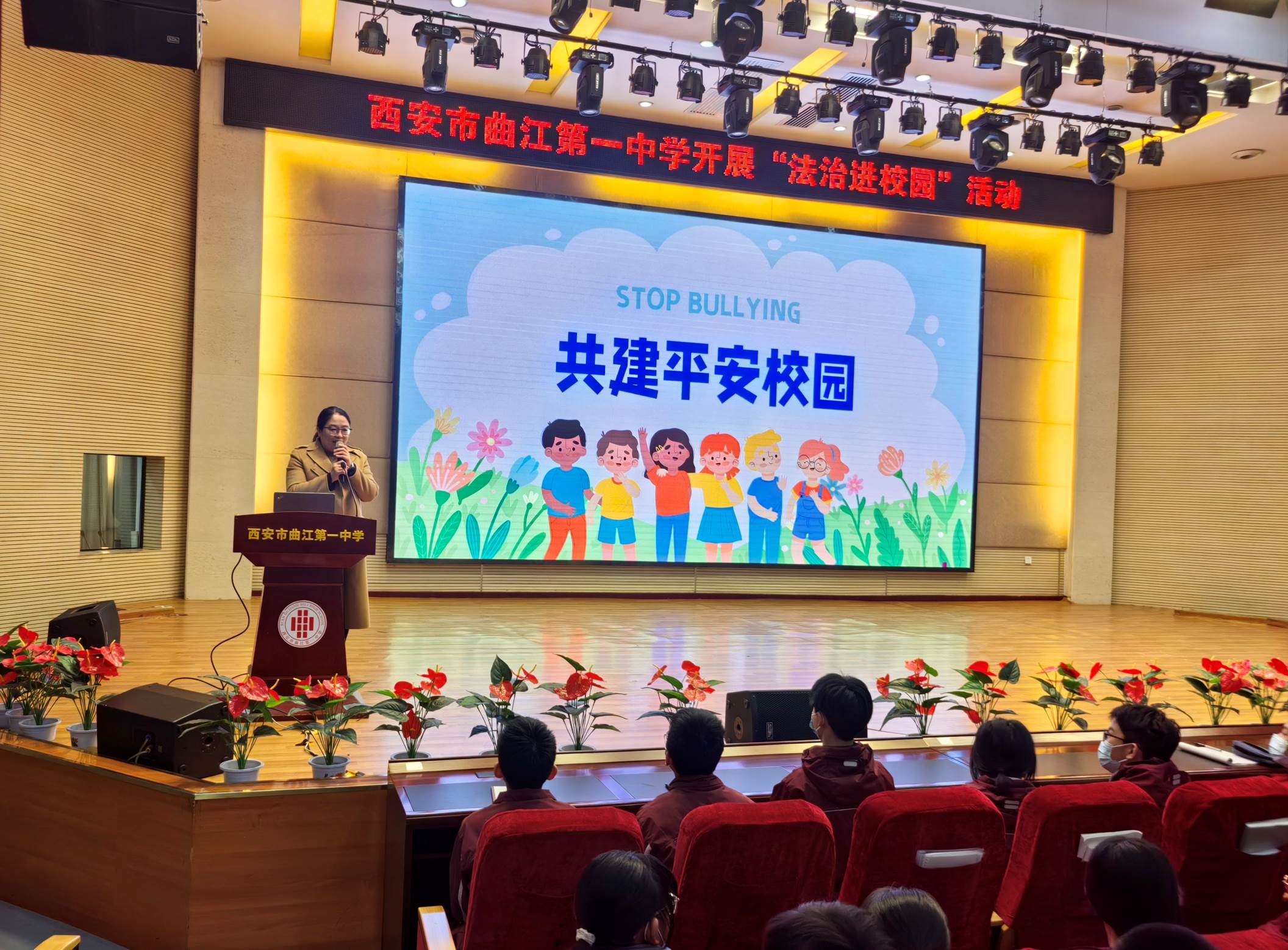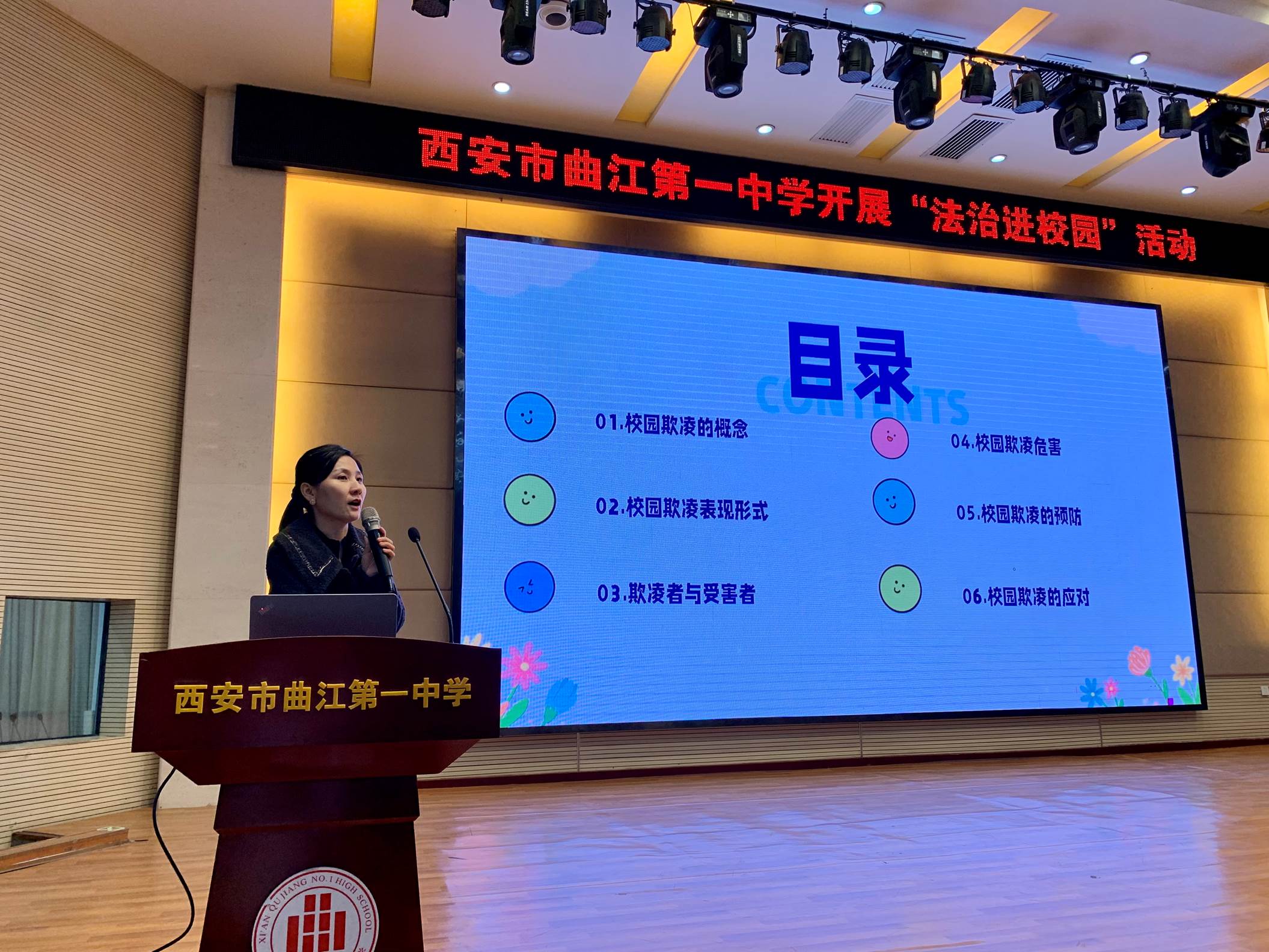 为进一步增强学生安全意识和自我保护能力,预防校园欺凌事件的发生,营造和谐的育人环境,2023年12月6日,西安市曲江第一中学法治副校长杨文来我校开展了以“预防校园欺凌”为主题的法治教育讲座。曲江一中初2022级部分班级参加,讲座由政教处副主任丁慧芸主持。