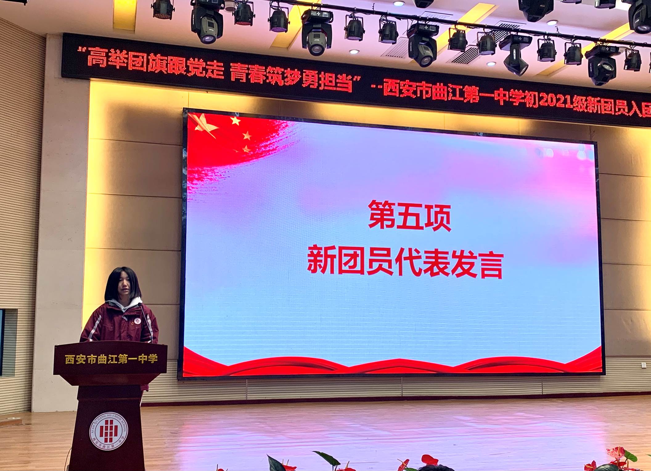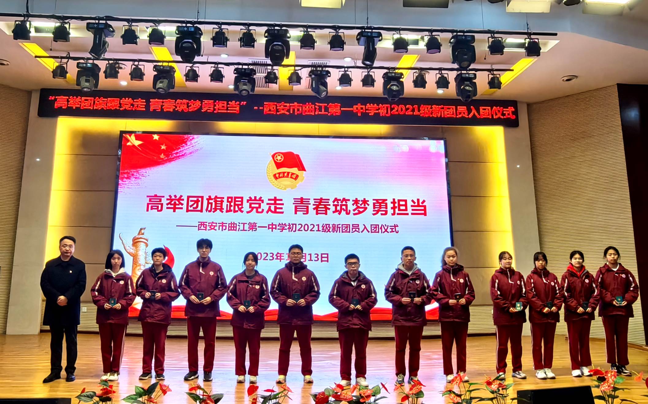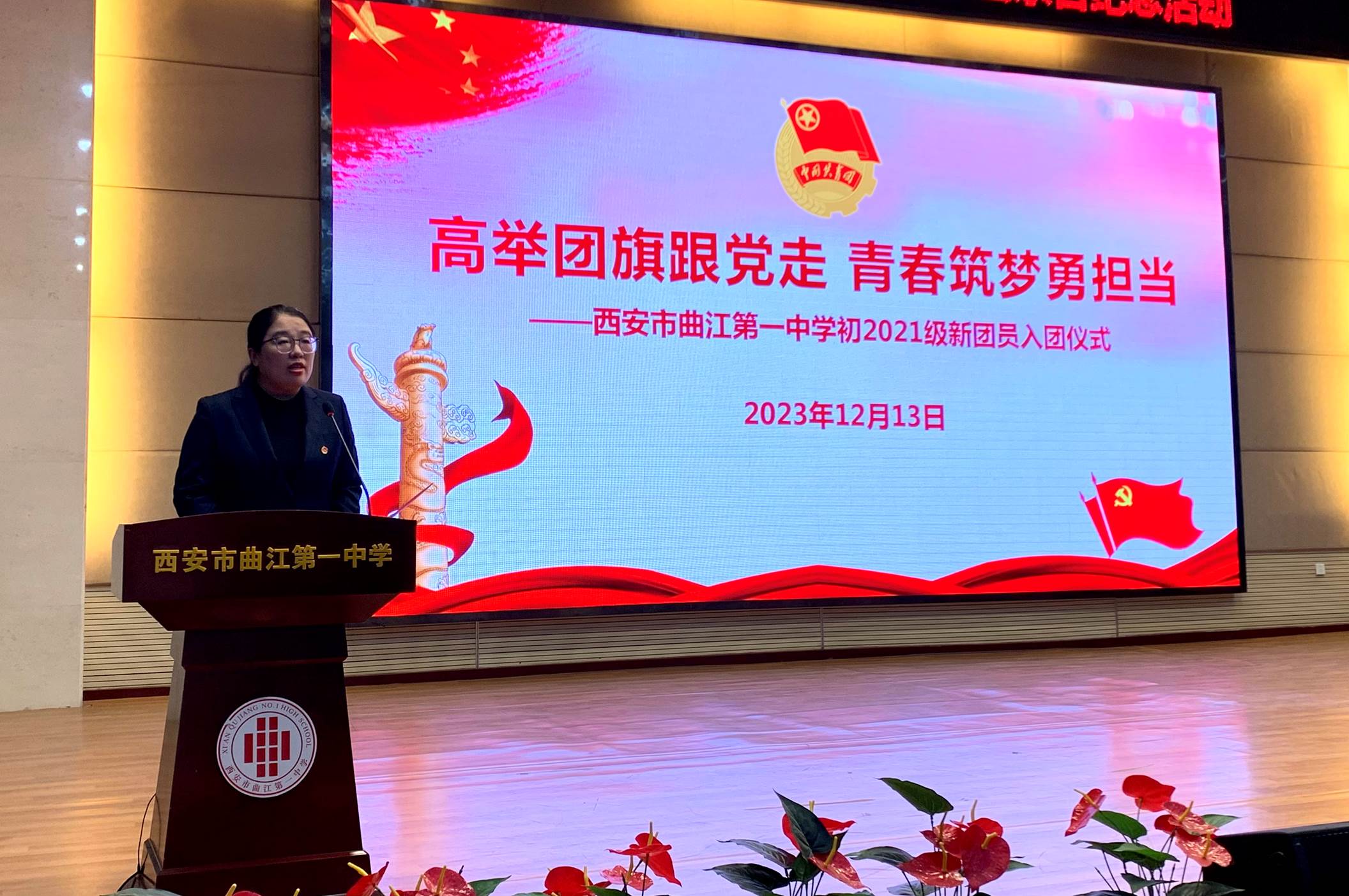 12月13日上午,西安市曲江第一中学在润德厅举行“高举团旗跟党走 青春筑梦勇担当”初2021级新团员入团仪式,深入学习宣传贯彻党的二十大精神,保持和增强团员的先进性,切实增强团员的光荣感,培养团员青年爱国、爱党、爱团的坚定信念。曲江一中校长陈勇刚、团委书记丁慧芸、团委副书记高文昌和120名新团员参加仪式,仪式由团委书记丁慧芸主持。