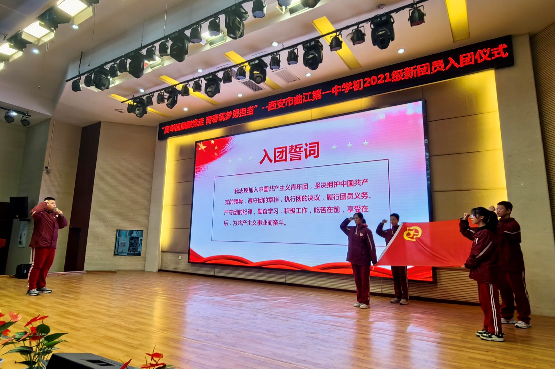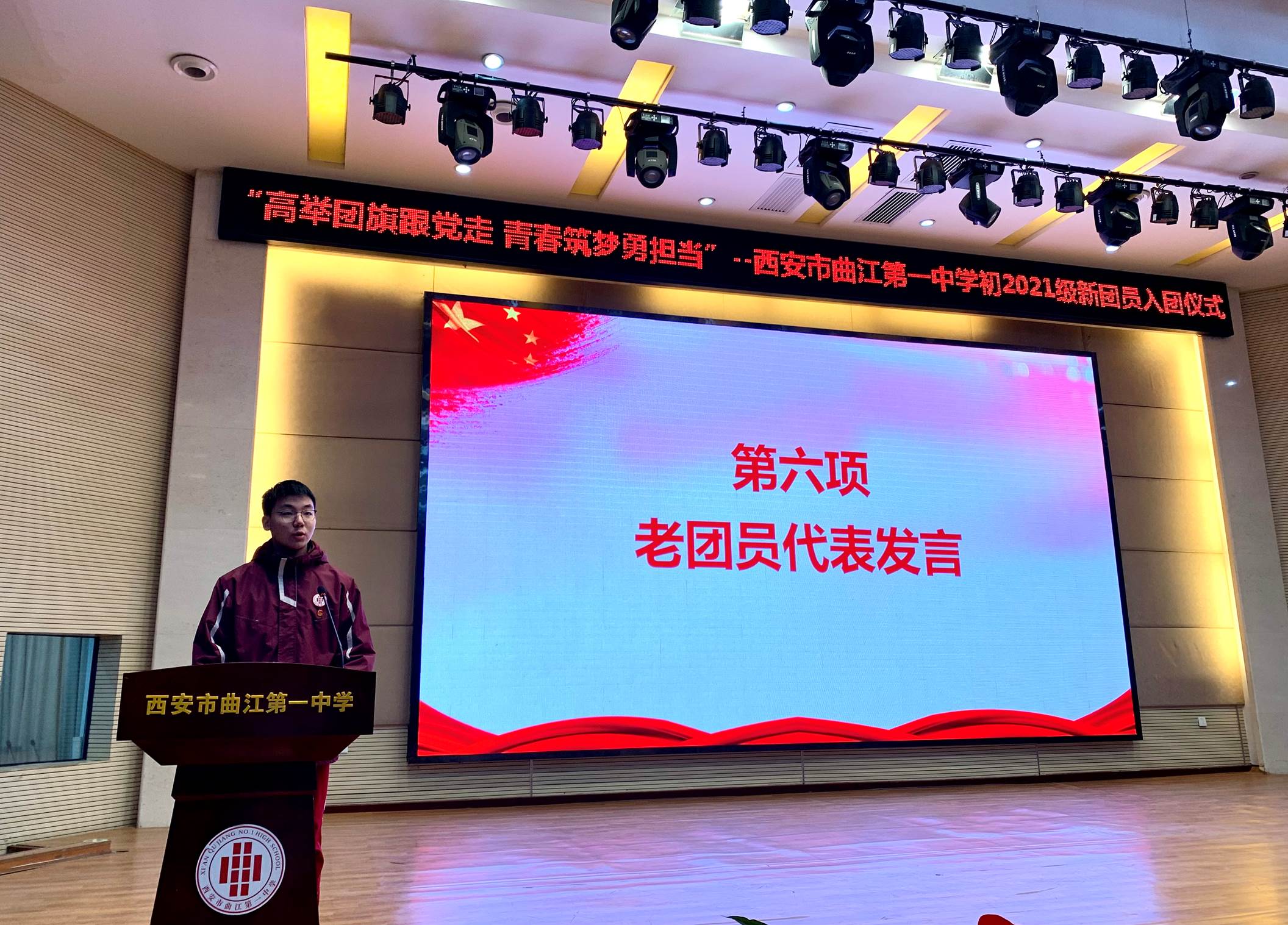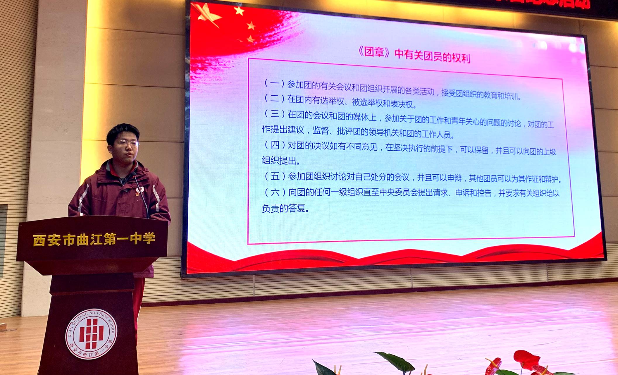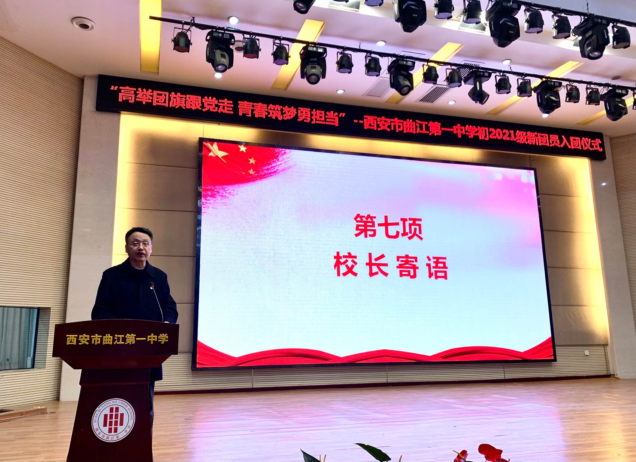 12月13日上午,西安市曲江第一中学在润德厅举行“高举团旗跟党走 青春筑梦勇担当”初2021级新团员入团仪式,深入学习宣传贯彻党的二十大精神,保持和增强团员的先进性,切实增强团员的光荣感,培养团员青年爱国、爱党、爱团的坚定信念。曲江一中校长陈勇刚、团委书记丁慧芸、团委副书记高文昌和120名新团员参加仪式,仪式由团委书记丁慧芸主持。