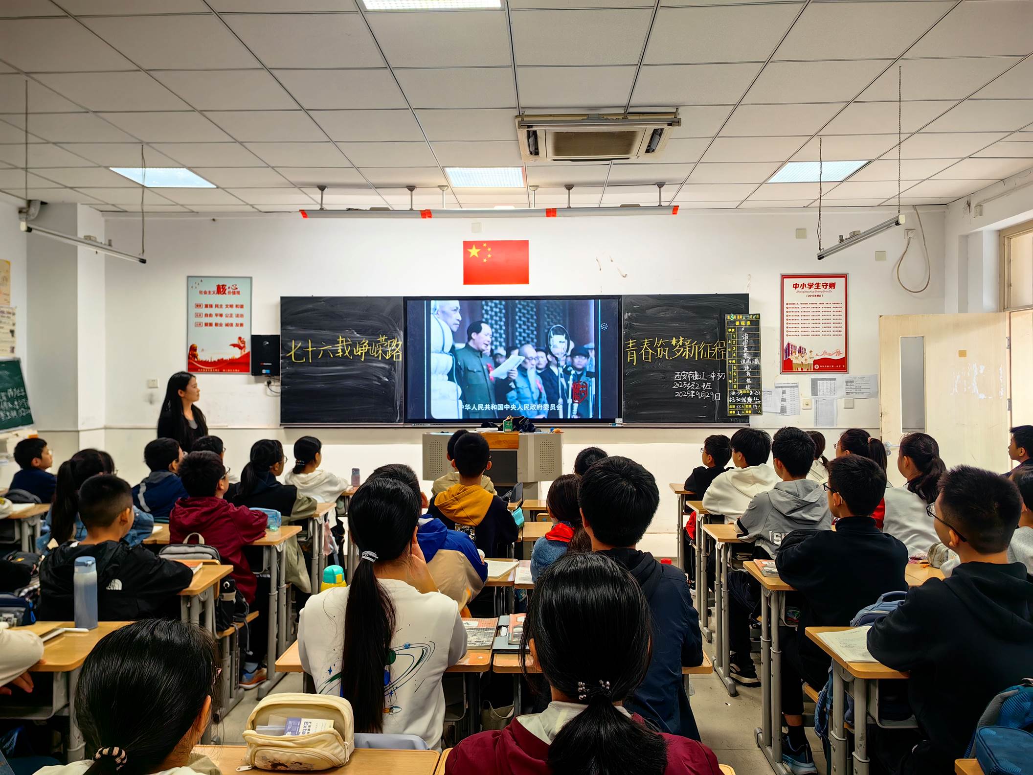 早班会时间,班主任们以1949年10月1日开国大典影像为切入点,带领学生回顾新中国成立的艰辛历程。班会内容涵盖国庆节的演变史、国庆节的由来、国旗、国徽、国歌的相关知识、国庆节的意义四个部分。《义勇军进行曲》诞生于1935年,田汉作词、聂耳作曲,原为电影《风云儿女》主题曲。班主任结合《国歌法》解读,学生了解到,奏唱国歌时,在场人员应当肃立,举止庄重,不得有不尊重国歌的行为。国歌不得用于或者变相用于商标、商业广告,不得在私人丧事活动等不适宜的场合使用,不得作为公共场所的背景音乐等。