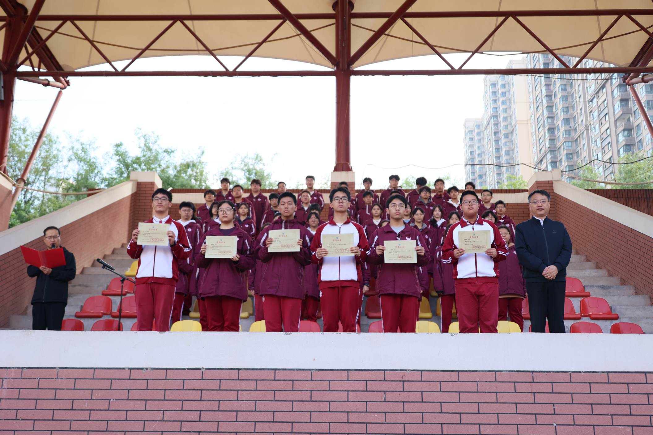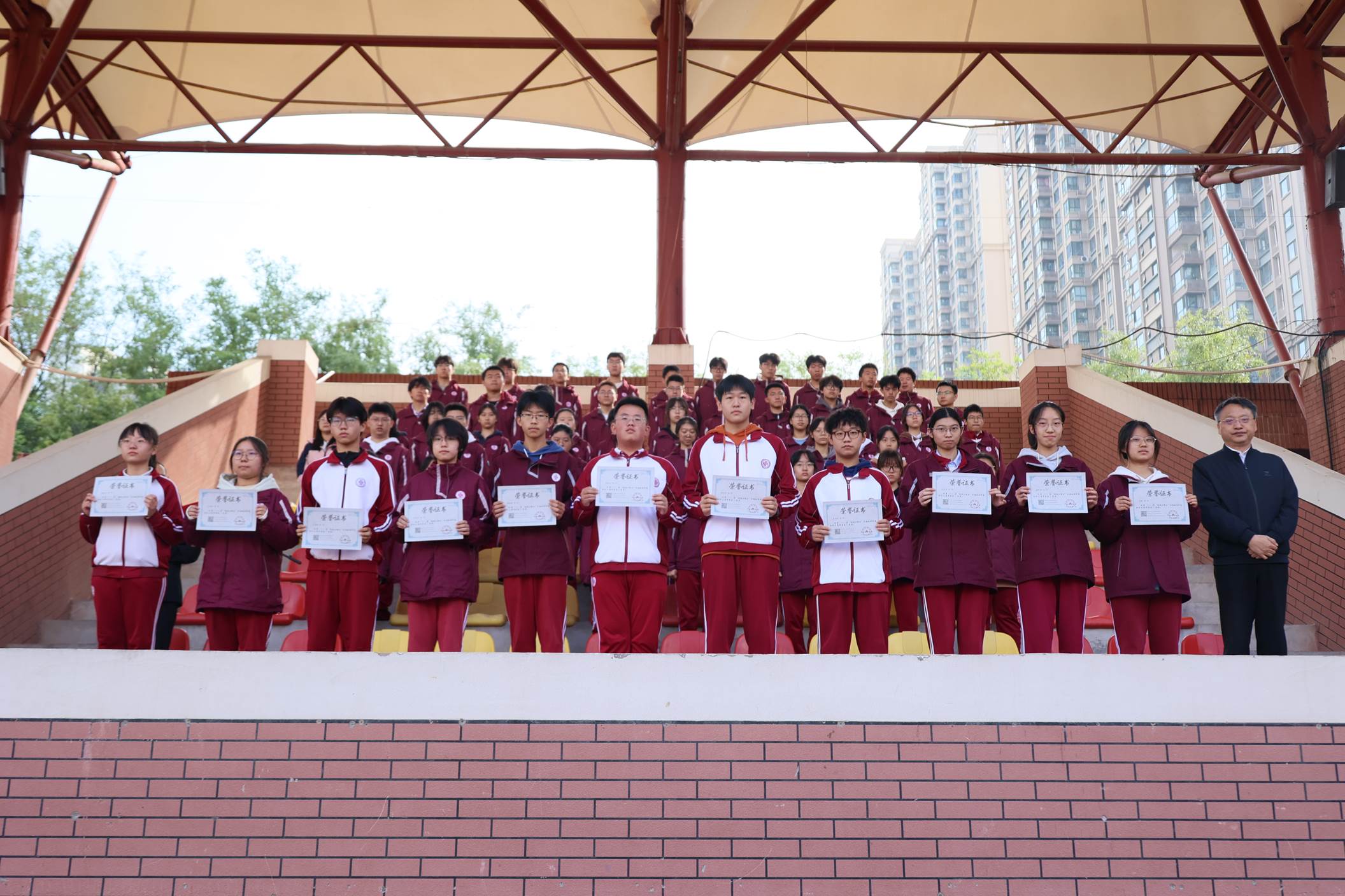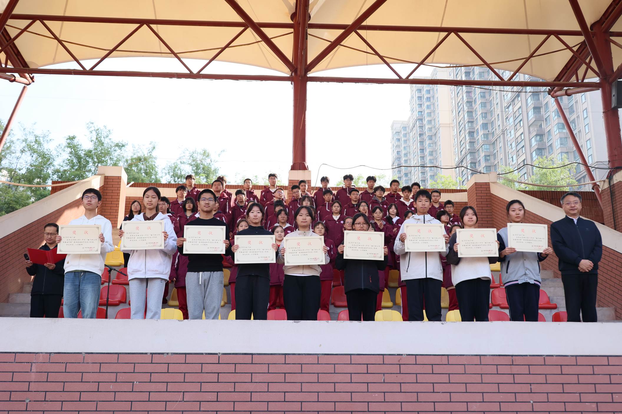 第三项,高2024级9班王禹心同学做一分钟英语演讲;第四项,宣读获奖消息,由陈校长为获奖学生颁发荣誉证书并合影留念。最后由高2023级6班李温铖、老浩然同学领诵经典诵读文本《行路难·其一》和曲江一中校训,嘹亮的诵读声响彻操场,豪迈的气势振奋人心。