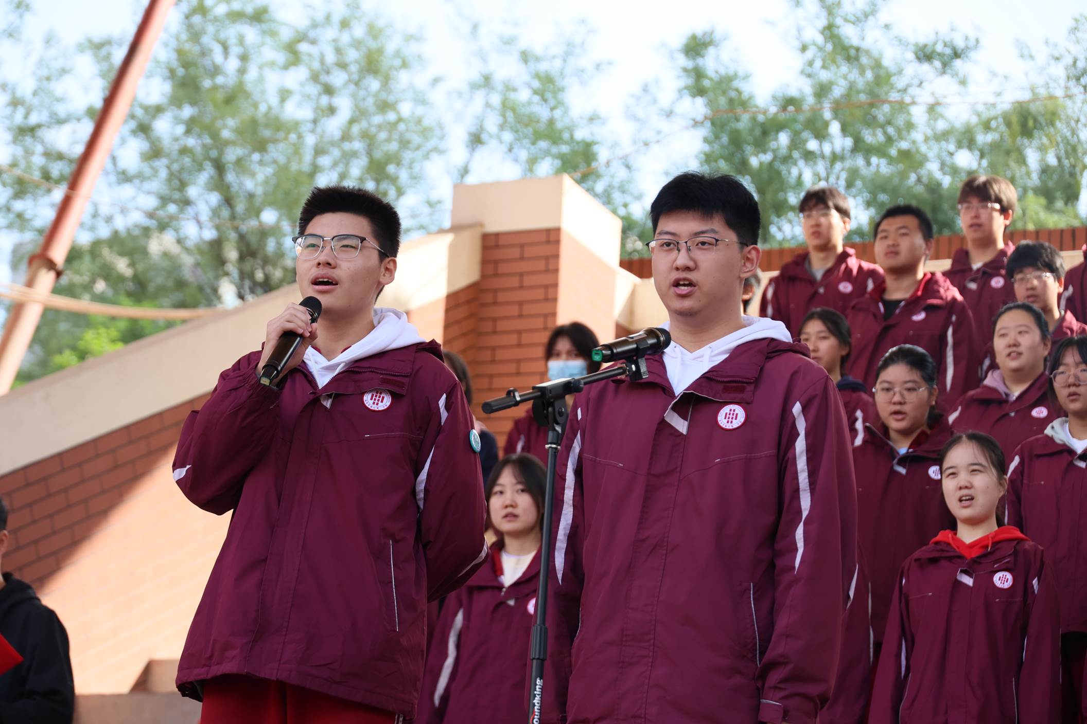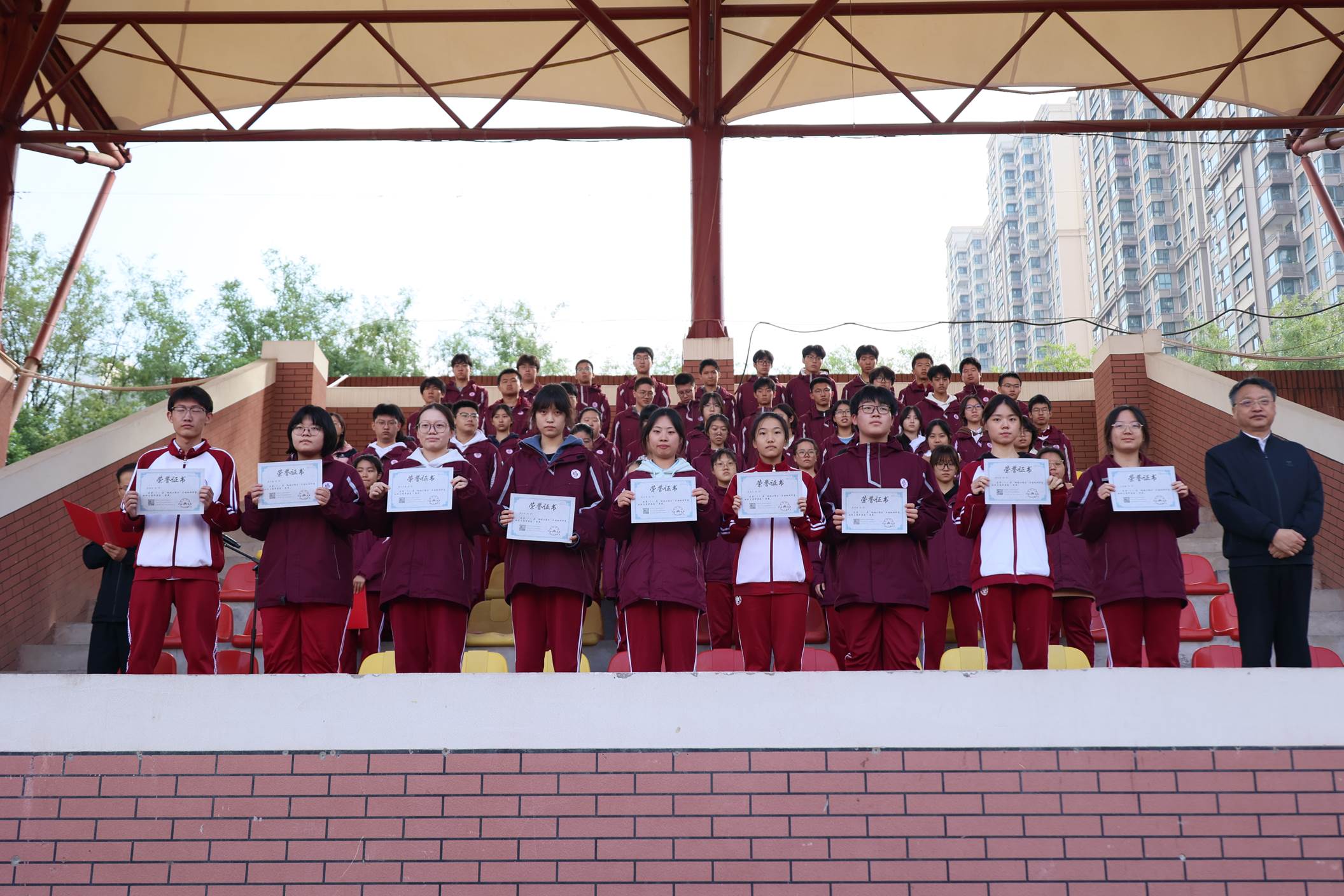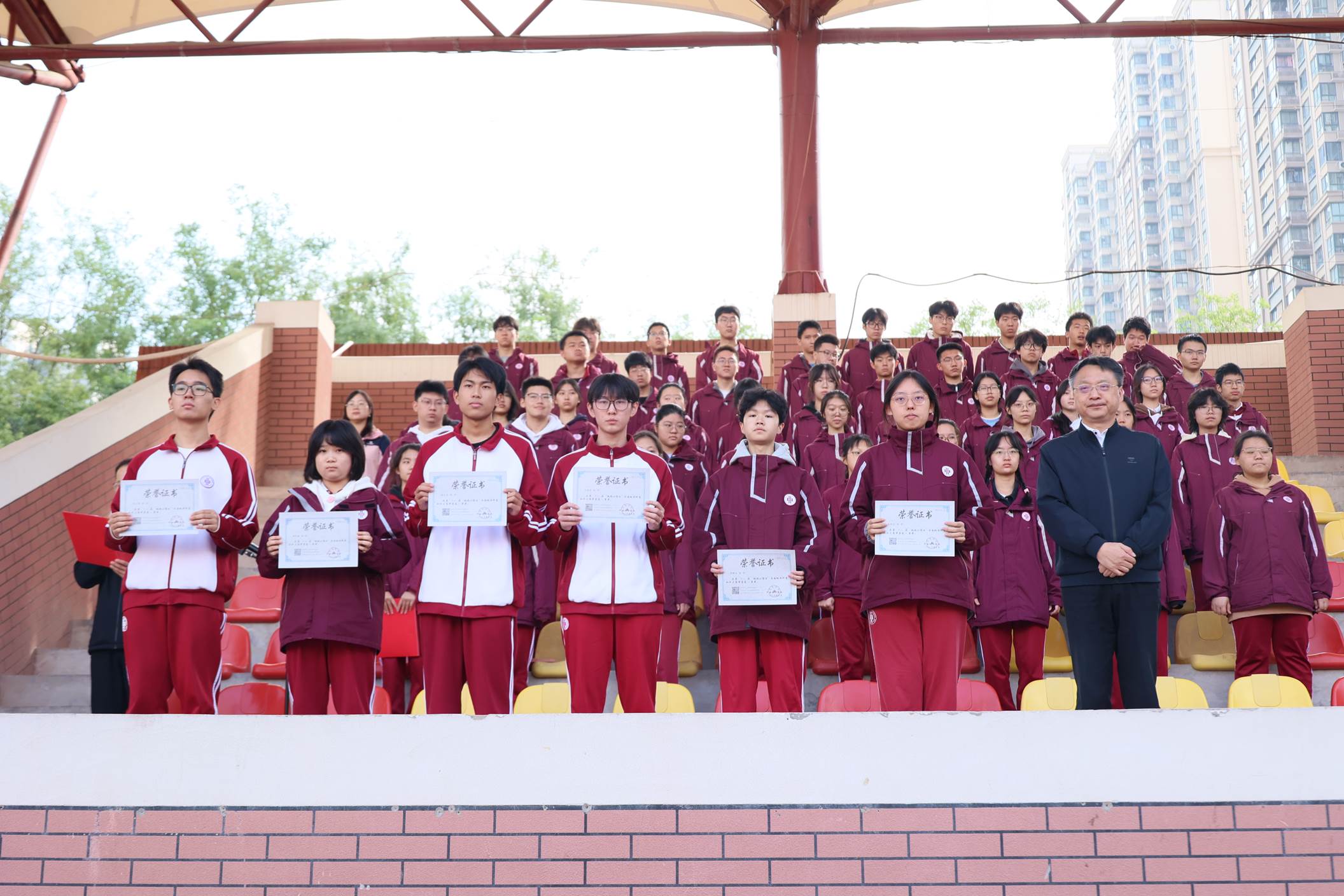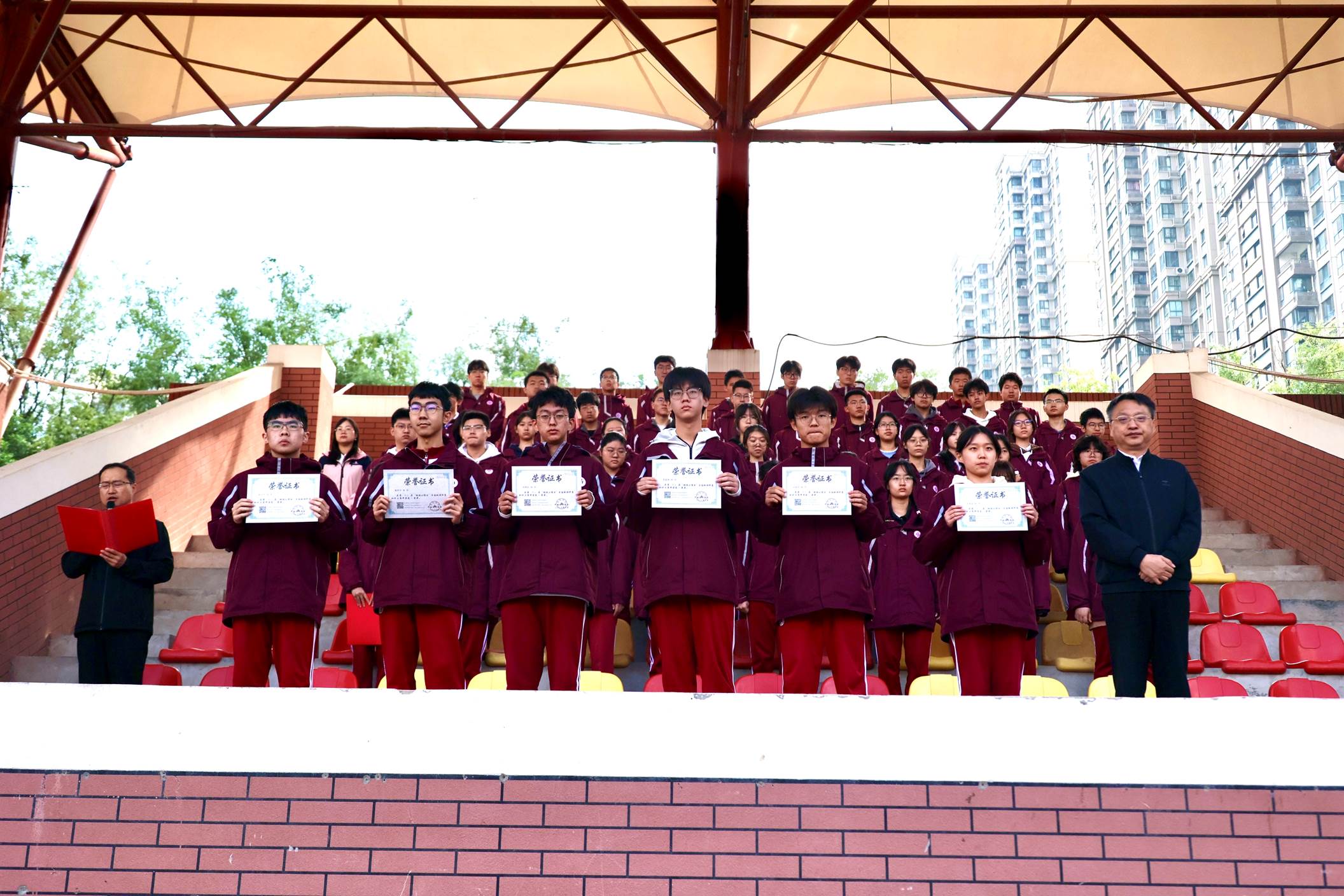第三项,高2024级9班王禹心同学做一分钟英语演讲;第四项,宣读获奖消息,由陈校长为获奖学生颁发荣誉证书并合影留念。最后由高2023级6班李温铖、老浩然同学领诵经典诵读文本《行路难·其一》和曲江一中校训,嘹亮的诵读声响彻操场,豪迈的气势振奋人心。