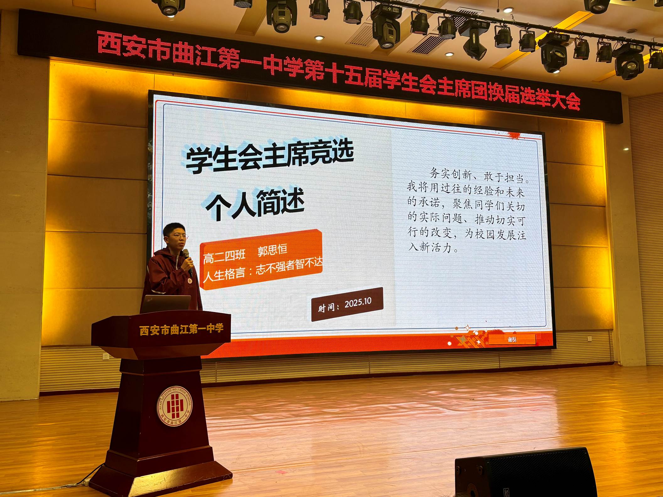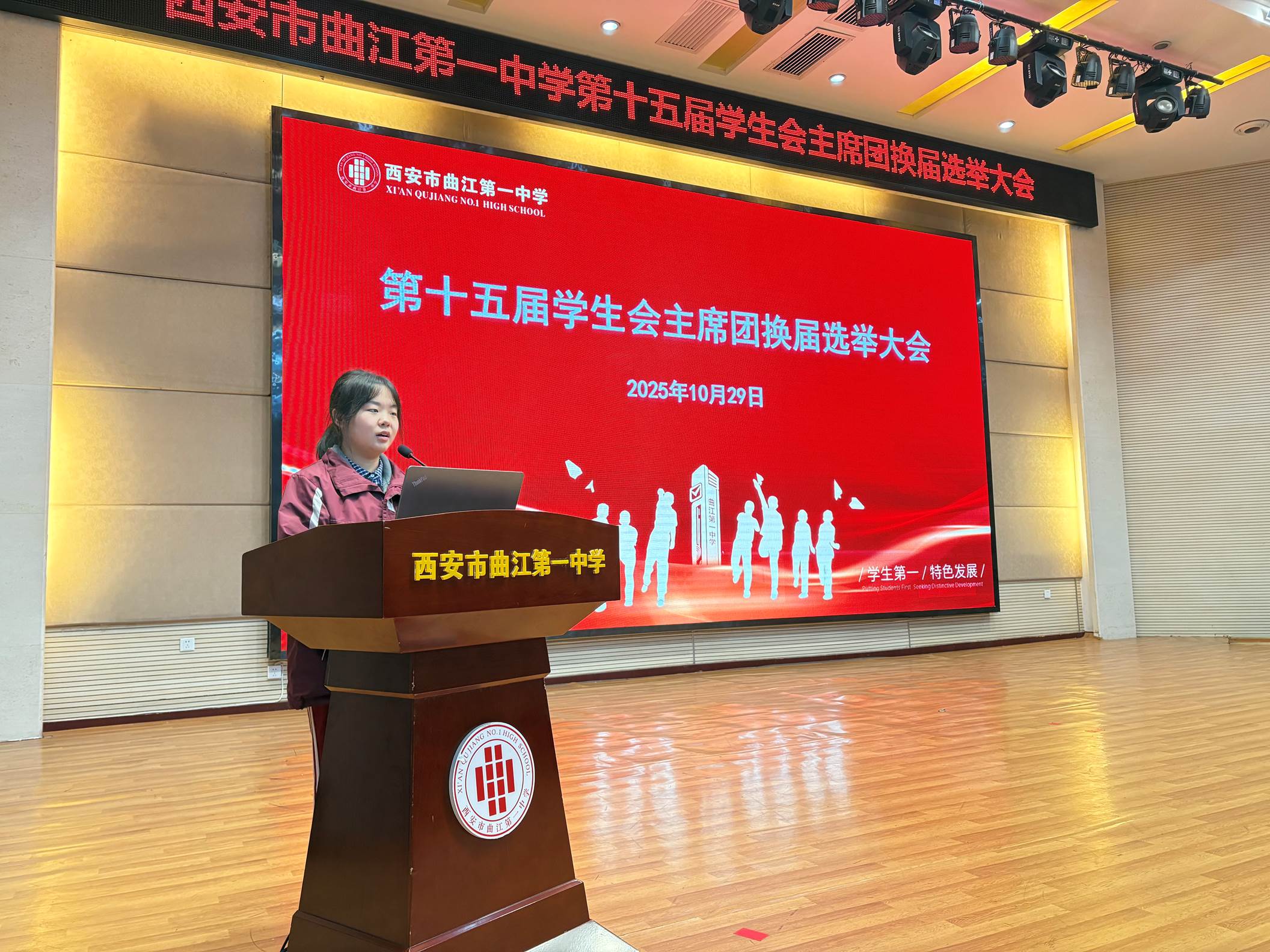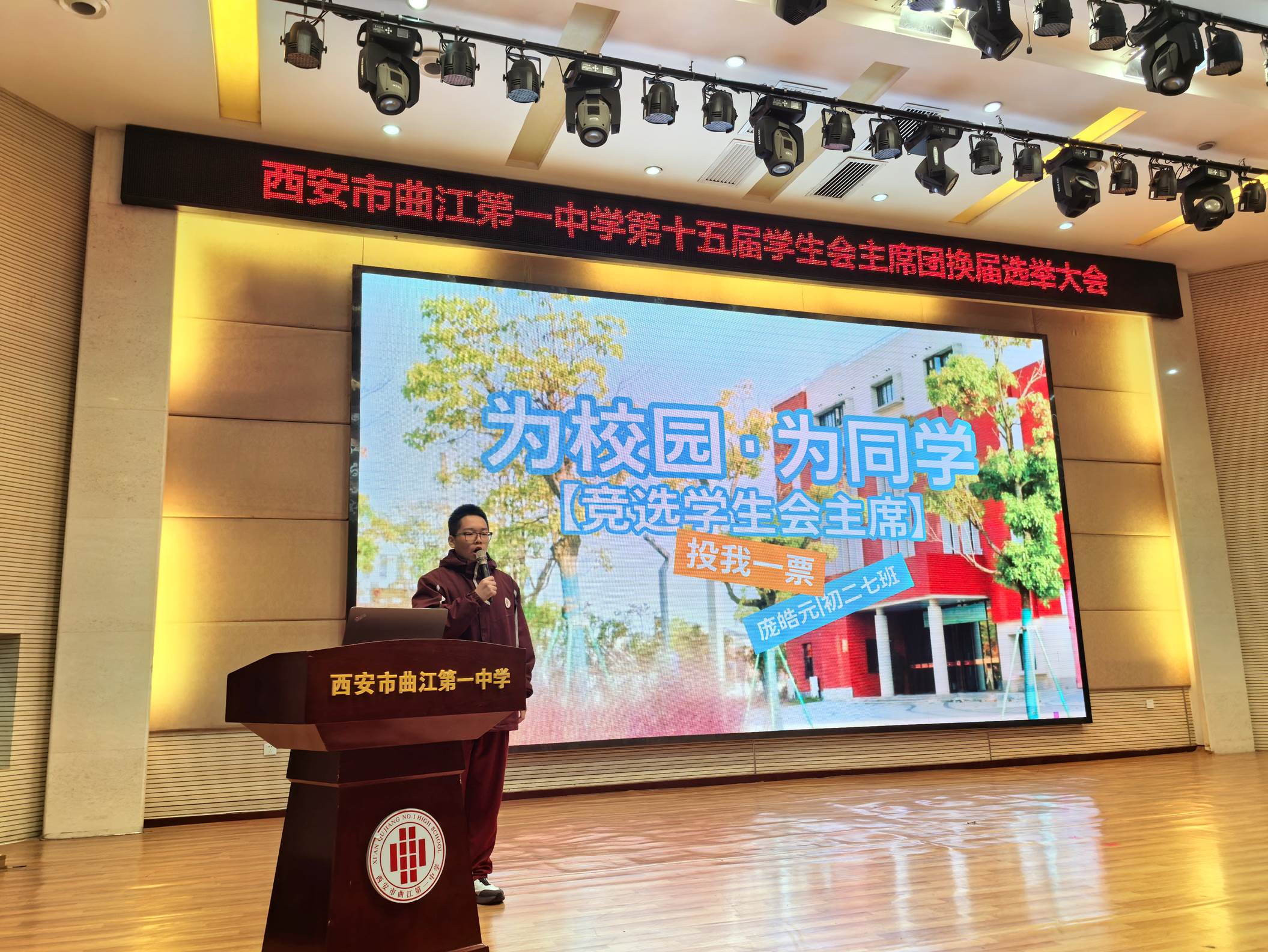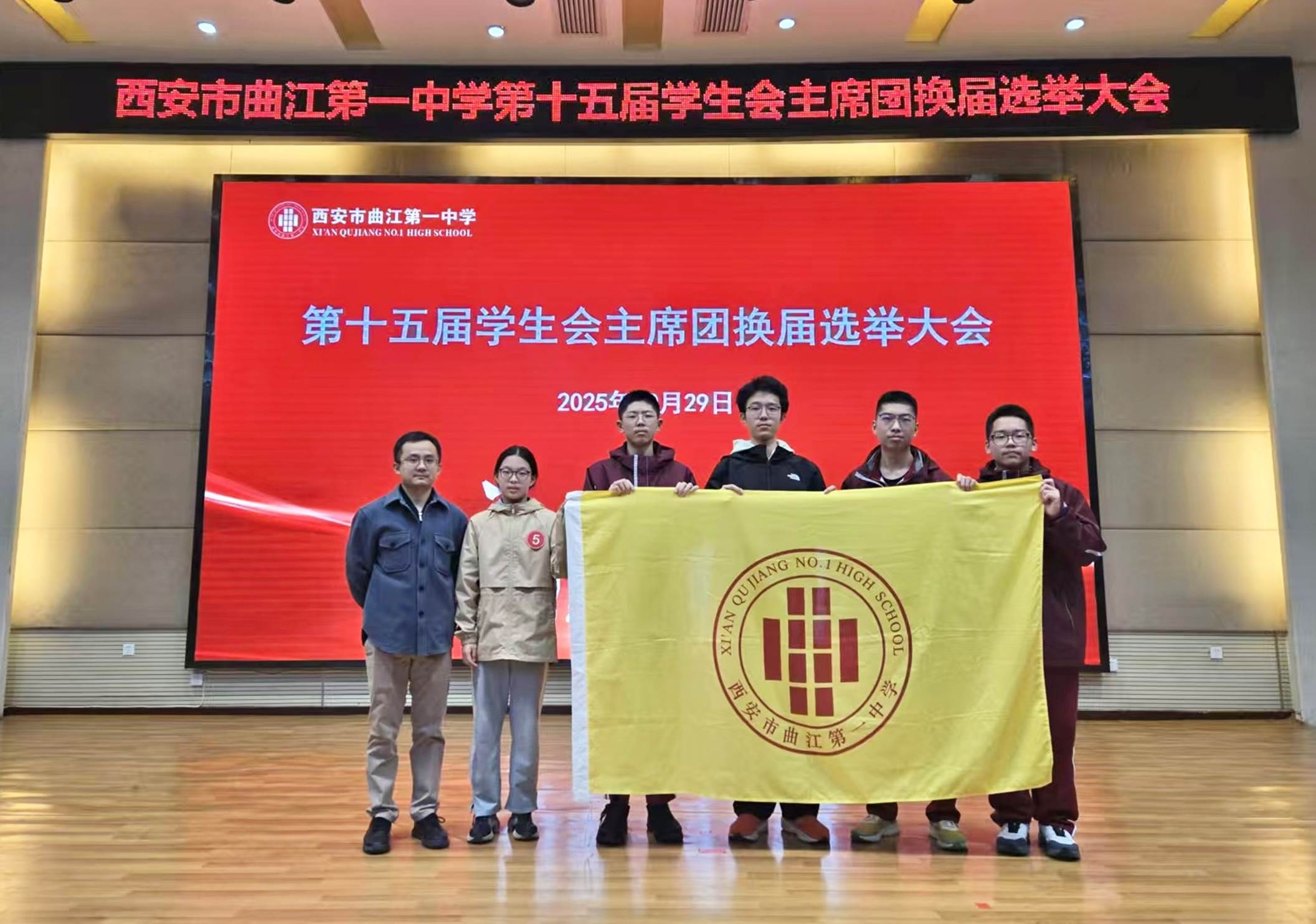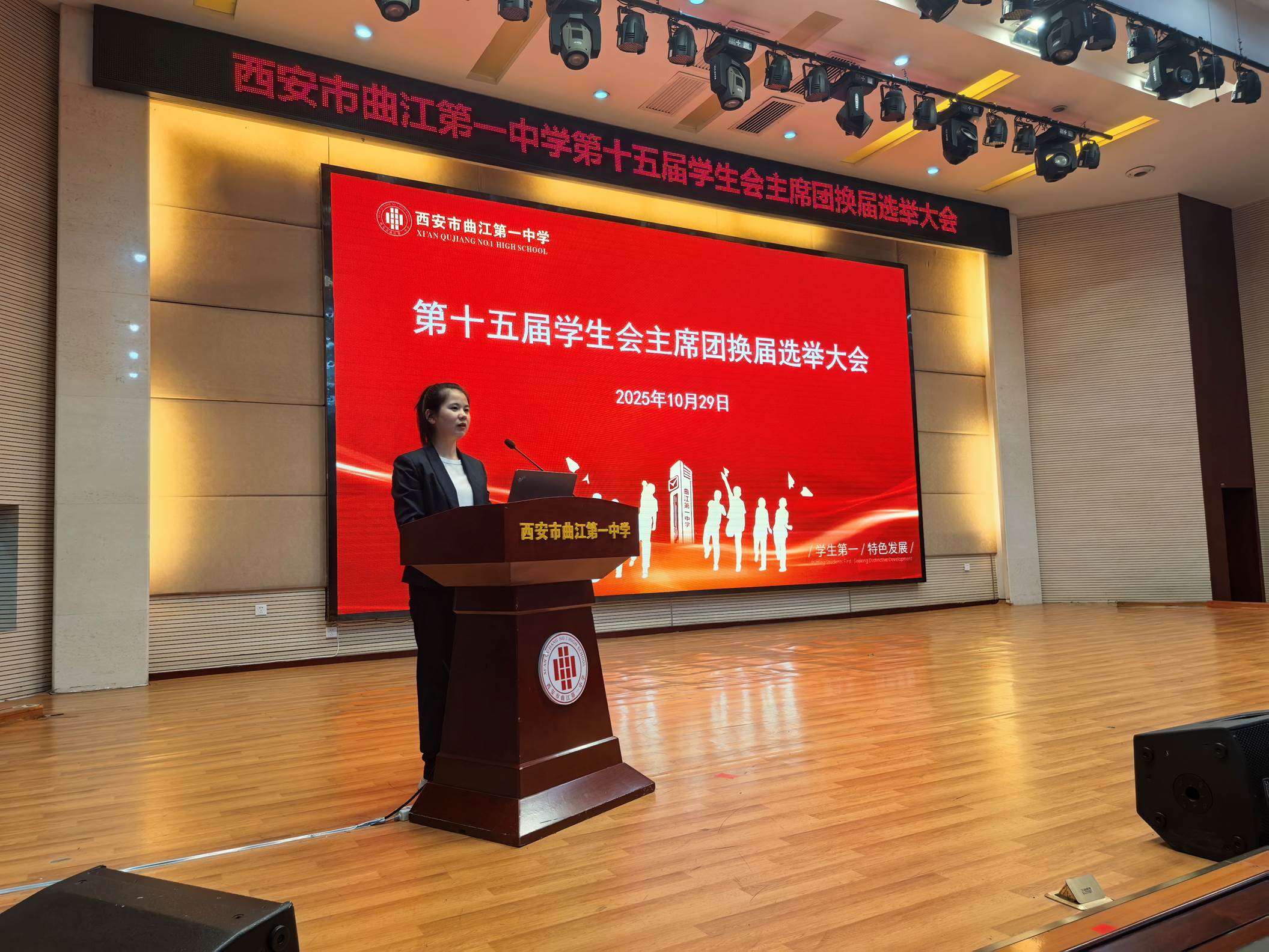 为更好地发挥学生自我教育、自我管理、自我服务的职能,2025年10月29日下午,西安市曲江第一中学第十五届学生会主席团换届选举大会在润德厅召开。曲江一中团委副书记高文昌,各年级教师代表及各班学生代表参加大会并参与投票。本次换届选举大会由团委老师陈妍主持。