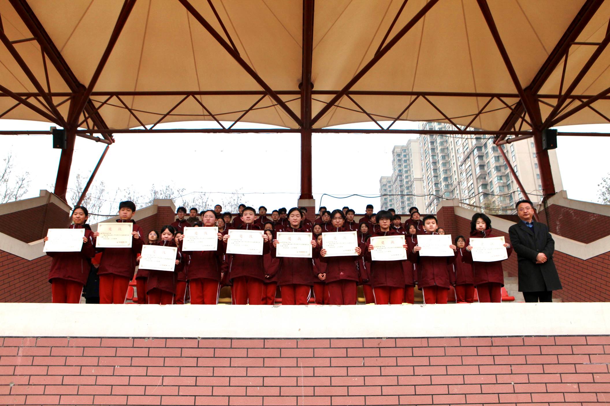 第三项,高2025级2班杨骐聪同学做一分钟英语演讲;第四项,宣读第17周获得“日常行为规范优秀班级”结果;第五项,宣读获奖消息,由校长陈勇刚为获奖学生颁发荣誉证书并合影留念。最后由高2024级7班郭庆阳、杨睿依同学领诵经典诵读文本《锦瑟》和曲江一中校训,嘹亮的诵读声响彻操场,豪迈的气势振奋人心。