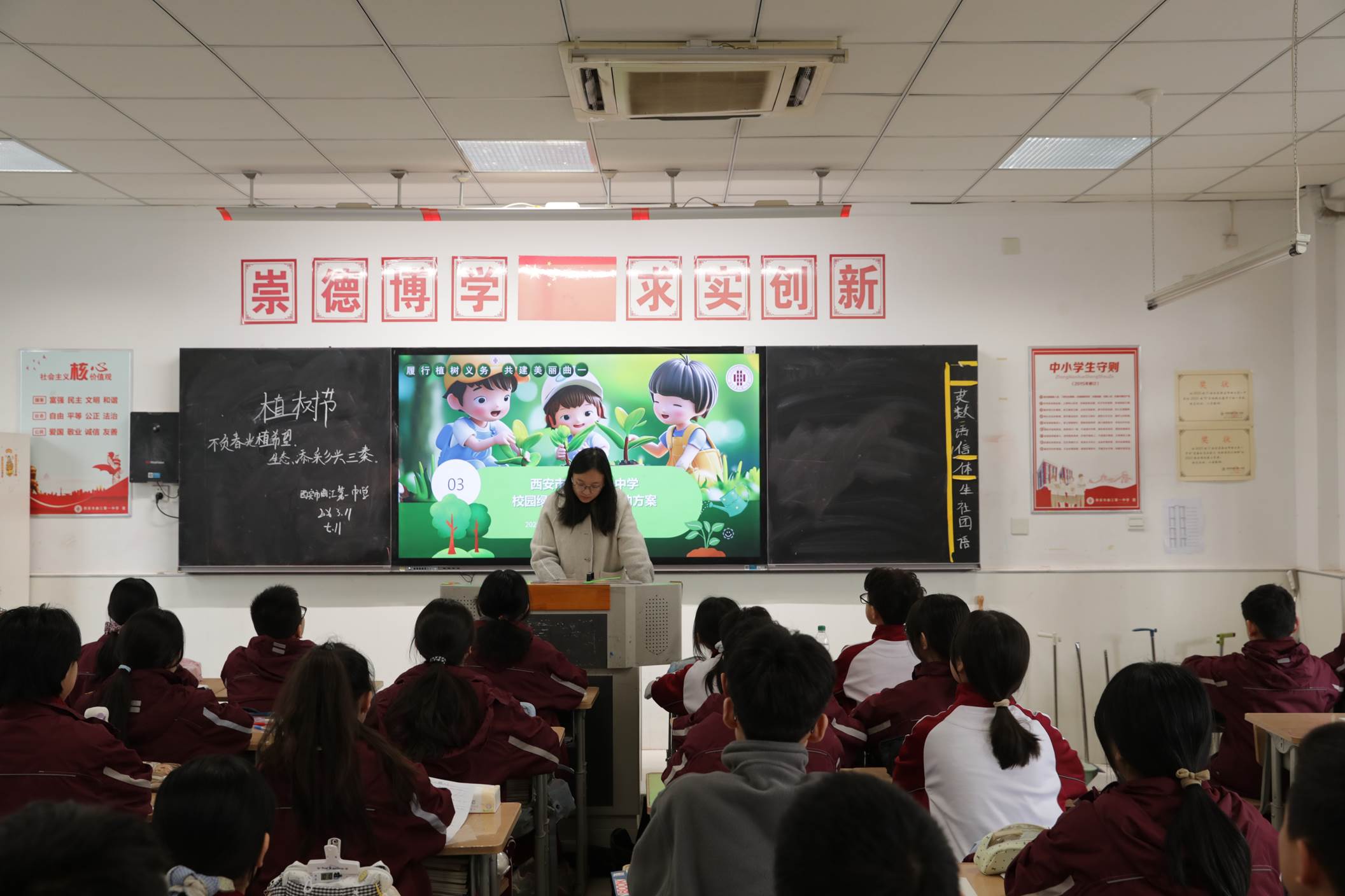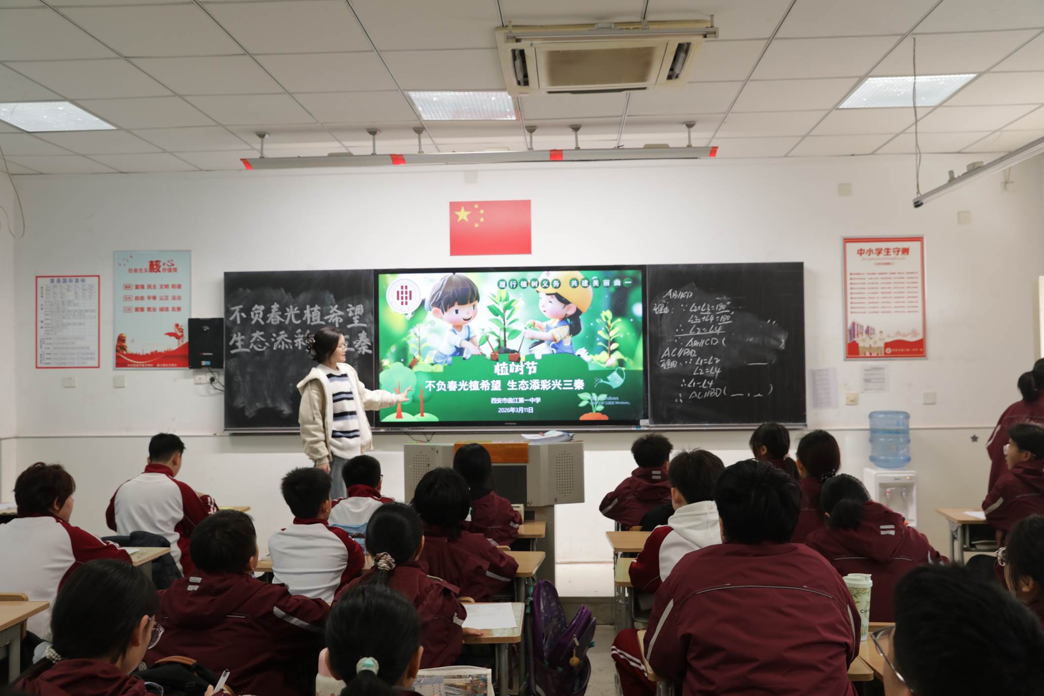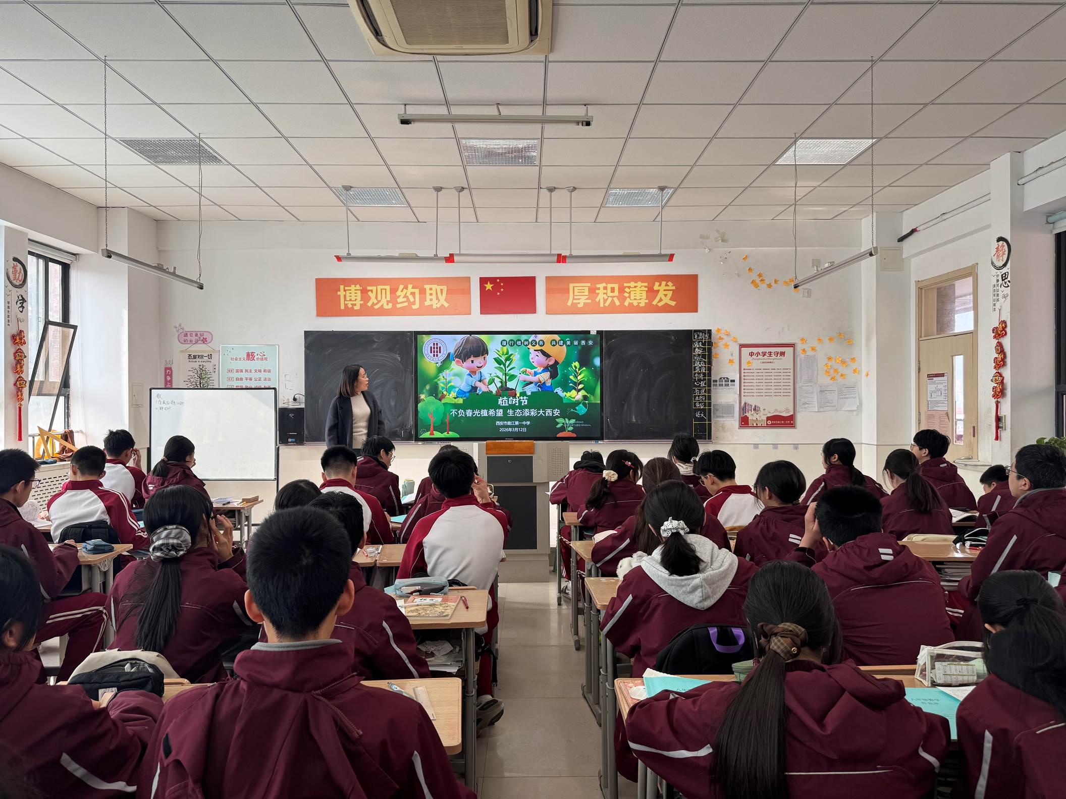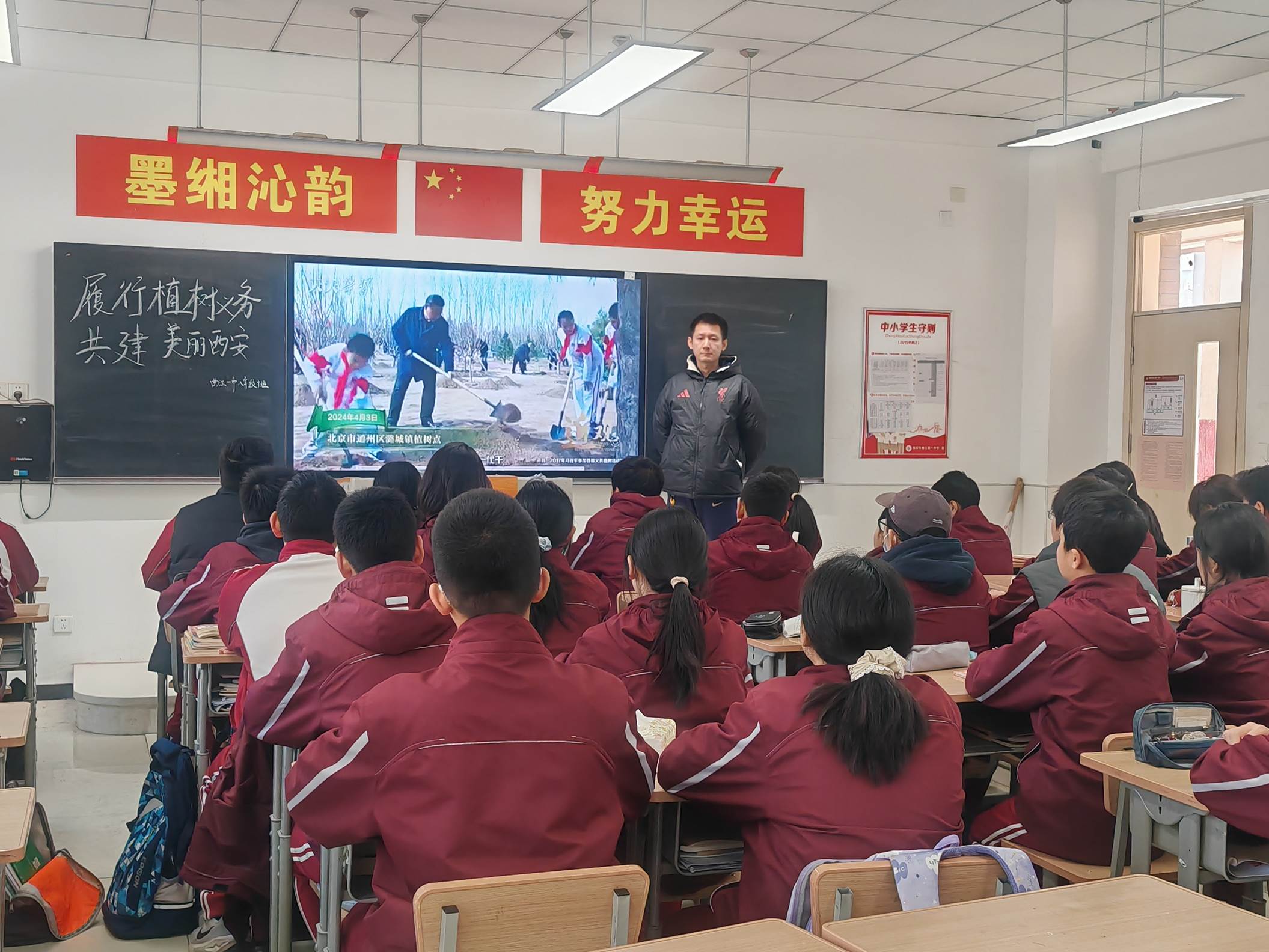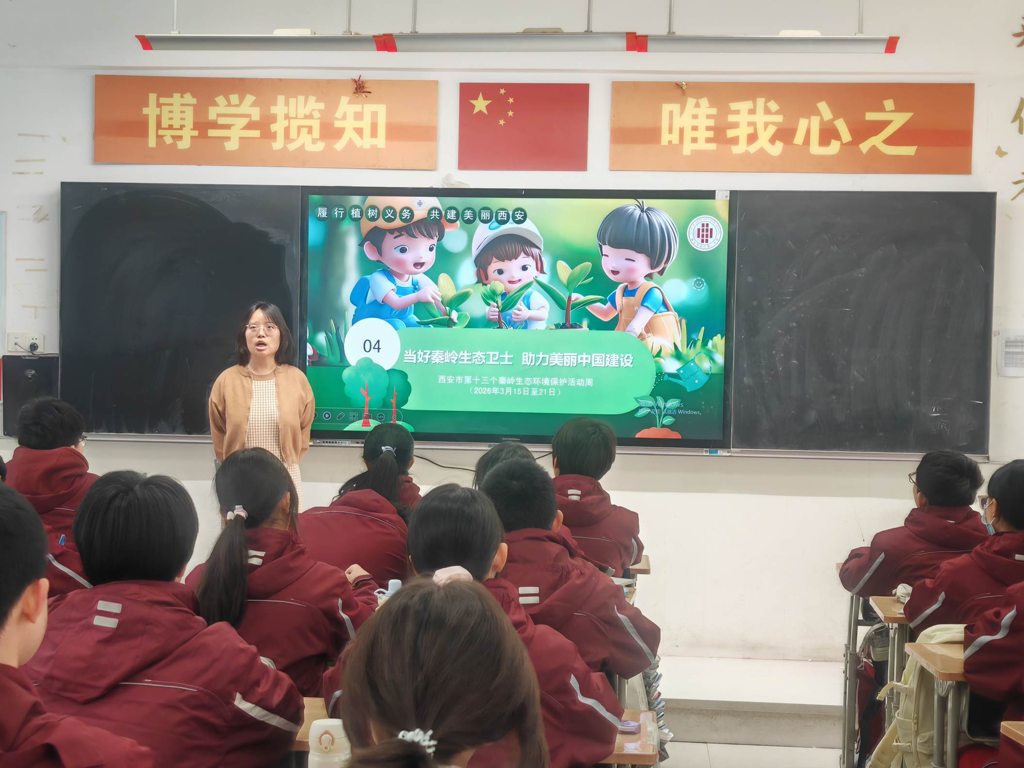 2026年3月11日,初2025级年级组召开“不负春光植希望 生态添彩兴三秦”主题班会,24个班级同频共振,同学们学习“两山论”理念的提出与发展历程,观看《这件“有意义的事”总书记连续十余年身体力行》视频。同学们以“履行植树义务,共建美丽中国”为主题,绘制班级名片,营造浓厚的植绿、护绿、爱绿氛围,为美丽西安添彩。