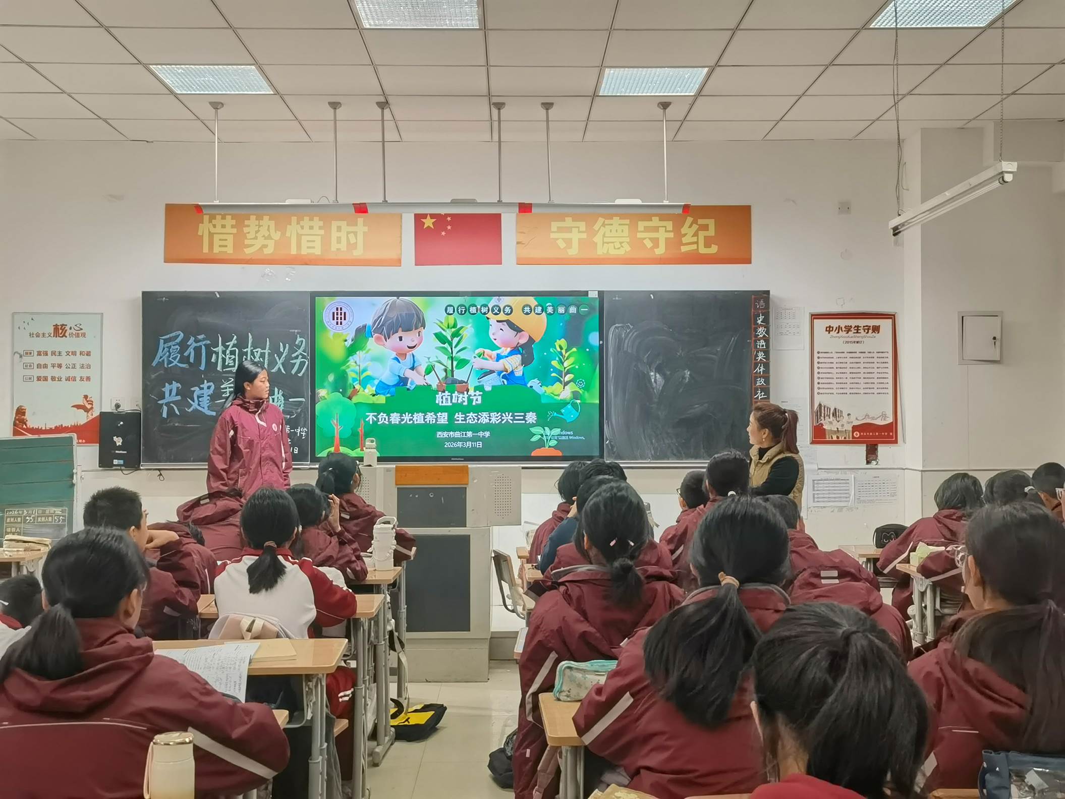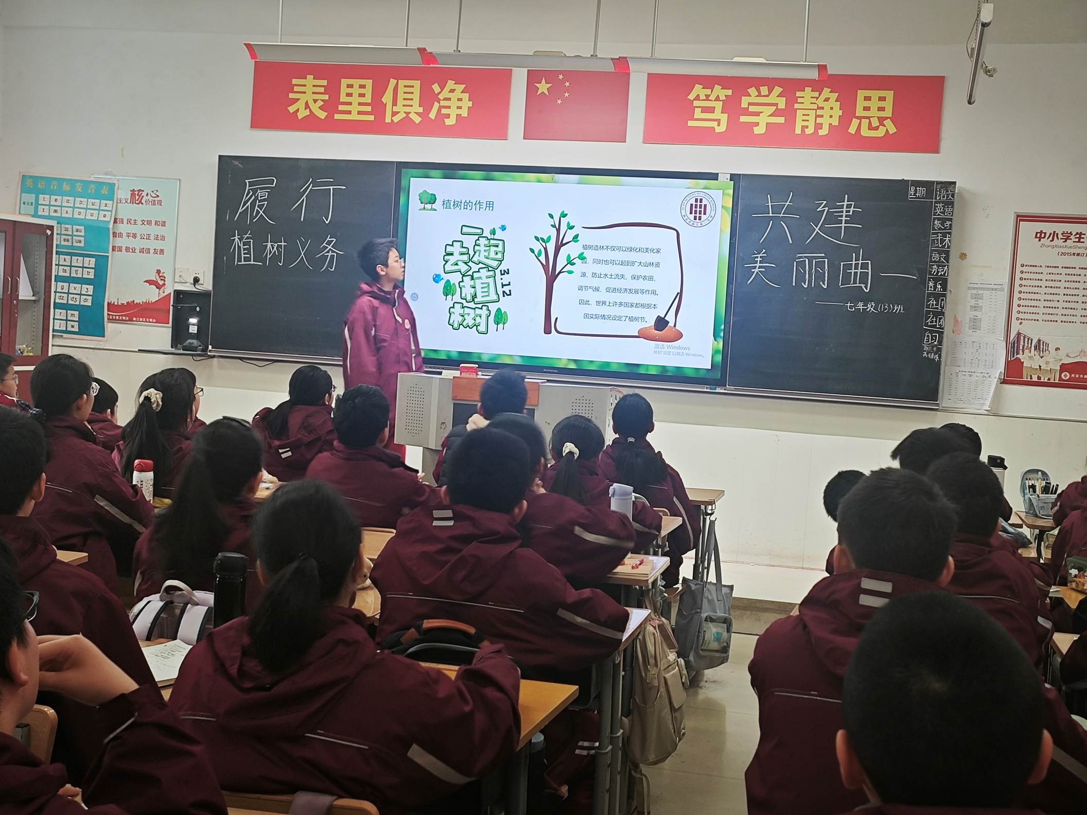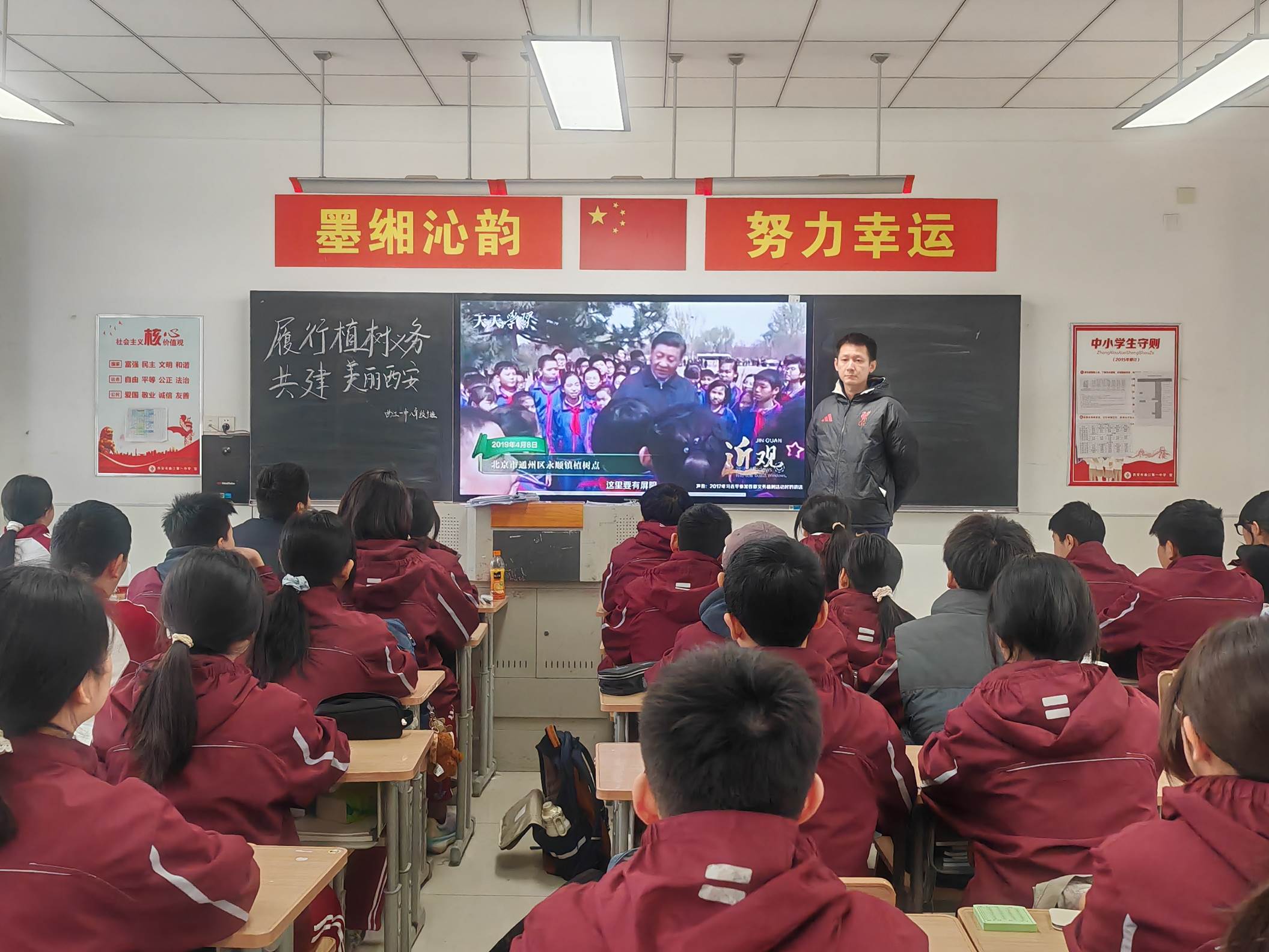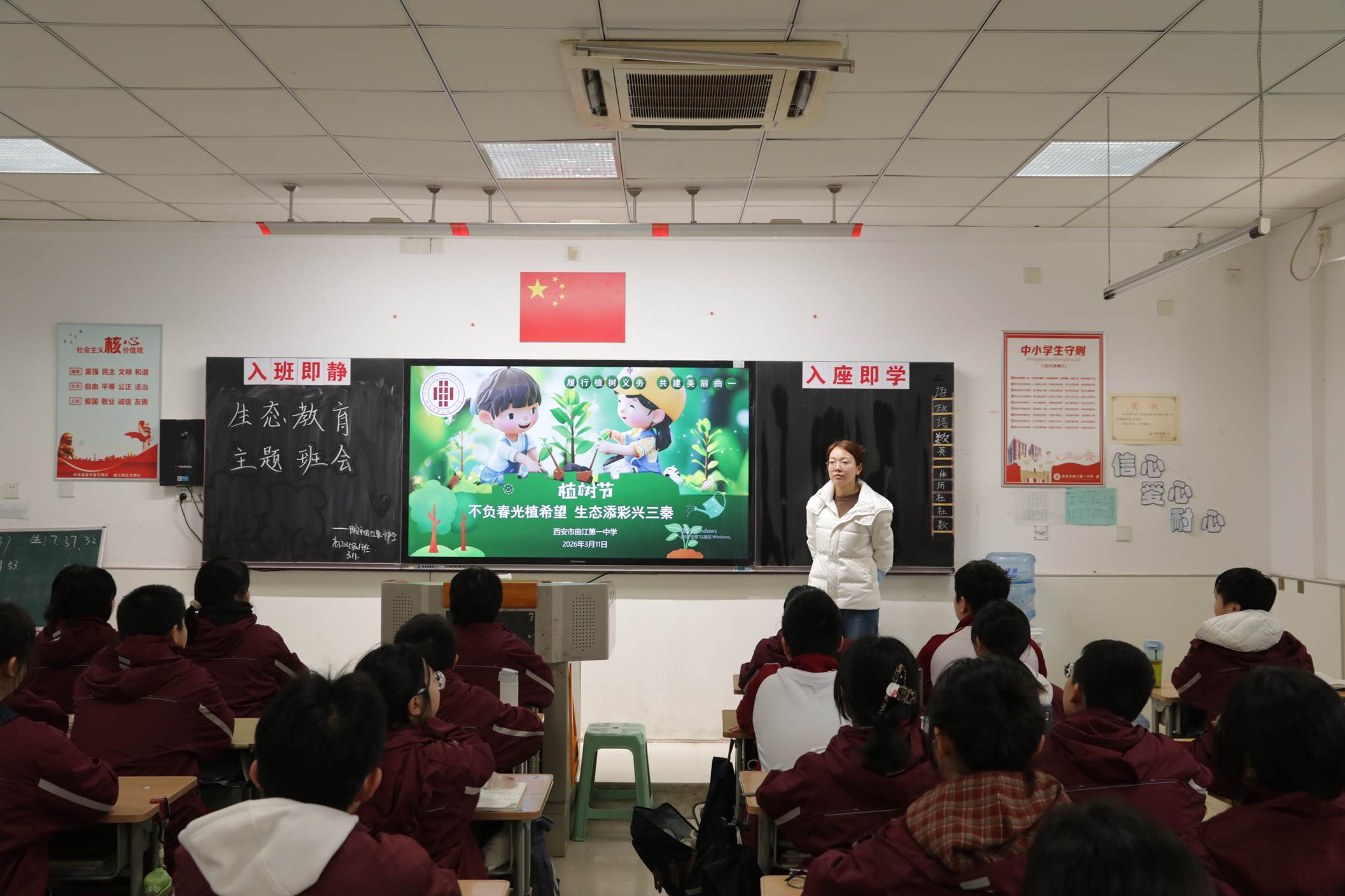2026年3月11日,初2025级年级组召开“不负春光植希望 生态添彩兴三秦”主题班会,24个班级同频共振,同学们学习“两山论”理念的提出与发展历程,观看《这件“有意义的事”总书记连续十余年身体力行》视频。同学们以“履行植树义务,共建美丽中国”为主题,绘制班级名片,营造浓厚的植绿、护绿、爱绿氛围,为美丽西安添彩。
