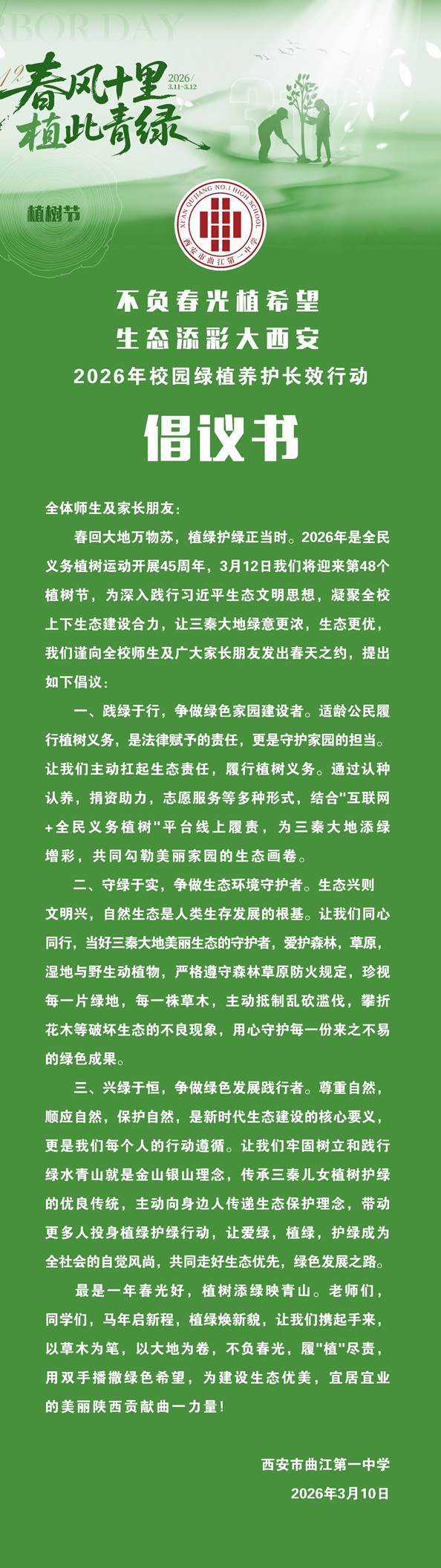 曲江一中将以此次活动为契机,持续深耕生态教育,开展绿植养护、生态宣传、环保实践等活动,推动爱国卫生运动常态化、长效化,引导全体师生以初心践使命、以行动提质增效,带动更多人参与到义务植树和生态保护中,用点滴行动汇聚生态力量,为建设生态宜居、文明美丽的西安,打造绿色和谐、充满生机的校园,书写生态育人与文明传承的新篇章贡献智慧与力量。