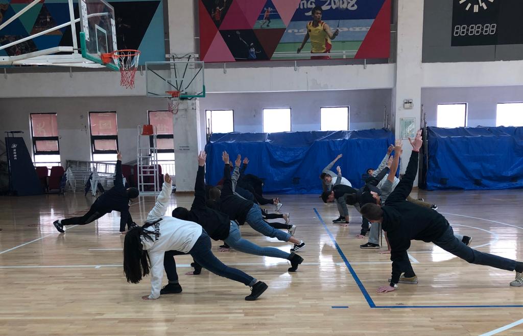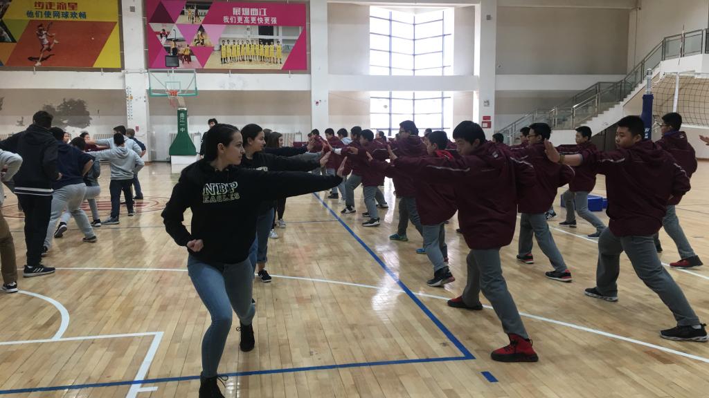 10:30,访学团走进体育馆,王嘉恒老师带领美方学生加入了初一年级一个班级的武术课,共同练习长拳基本动作。王嘉恒老师首先带领中美双方学生进行热身运动,接着教授了一套漂亮武术动作,随后分别指导和规范了每位同学的基本动作。武术作为中华民族炎黄子孙的生存技能,伴随着中国历史与文明发展走过了几千年的风雨历程。中国武术成为维系民族生存和发展的魂与承载中华儿女基因构成的魄。修习武术,使得双方学生从身到心、由魂而魄安然自胜。通过武术学习,美方访学团师生了解了中华文明历代沉淀安魂守魄、崇尚和平的精神。