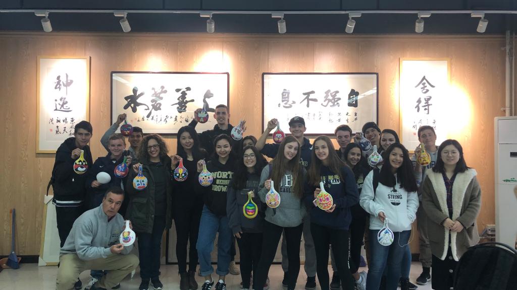 随后,访学团一行来到张梦玥老师的马勺制作课堂。马勺原本是先民的一种生活用具,从夏商沿用至今。当马勺不再作为生活用具后,艺术家们将社火脸谱绘制在马勺上,放置在屋宅之内,用于驱鬼辟邪、祈福纳祥。社火马勺脸谱传承着中华上下五千年的渊远文明,记载着周秦文化最辉煌的民俗过程。访学团师生依照传统纹样模板,加之自己的想象力和色彩感觉,独立完成了各自马勺脸谱的创作。课程结束前,美方师生分别对自己的作品进行讲解和展示,并感叹中国传统艺术和文化的独特魅力。