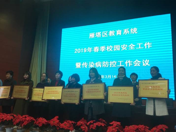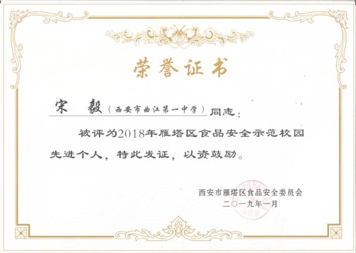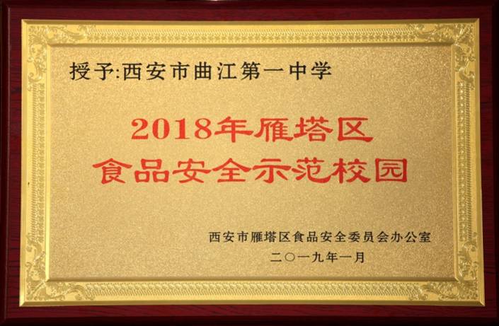 2019年3月在雁塔区食品安全示范校园创建活动中,曲江一中凭借过去一年来扎实稳健的食品安全管理工作,喜获“雁塔区食品安全示范校园”称号,总务干事宋毅老师获得“食品安全示范校园先进个人”称号。