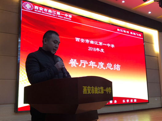 1月28日14时,本次大会在曲江一中润德厅如期召开,总务处主任王锦、圣境物业学校项目部经理寇鹏超、远清餐饮项目经理毛浓旭以及全体后勤人员出席了本次会议。首先,王主任主持了大会的第一项内容后勤工作总结大会,物业、餐厅经理分别对各自项目部2018年的工作进行总结,对一年来完成的日常工作及员工培训、市药监局检查等专项工作进行总结。