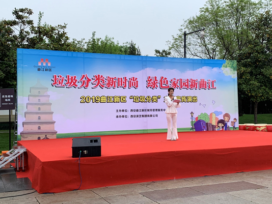 4月13日下午,在曲江池遗址公园中和广场举办了以“垃圾分类新时尚 绿色家园新曲江”为主题的大型演出活动,曲江新区机关干部员工、市民群众、媒体代表、社区工作者、志愿者等300余人共同观看演出,曲江一中垃圾分类相关人员也参与了本次活动。