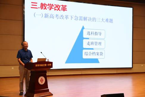 随后刘主任从核心素养、高考改革、教学改革三个方面发表了主题演讲,向在场的各位教师讲解了最新一轮课程改革中核心素养的内涵及意义,介绍了高考改革中陕西省的基本要求及措施,并就新高考改革下急需解决的综合档案袋、走班管理、选科指导三个难题谈了自己的看法。