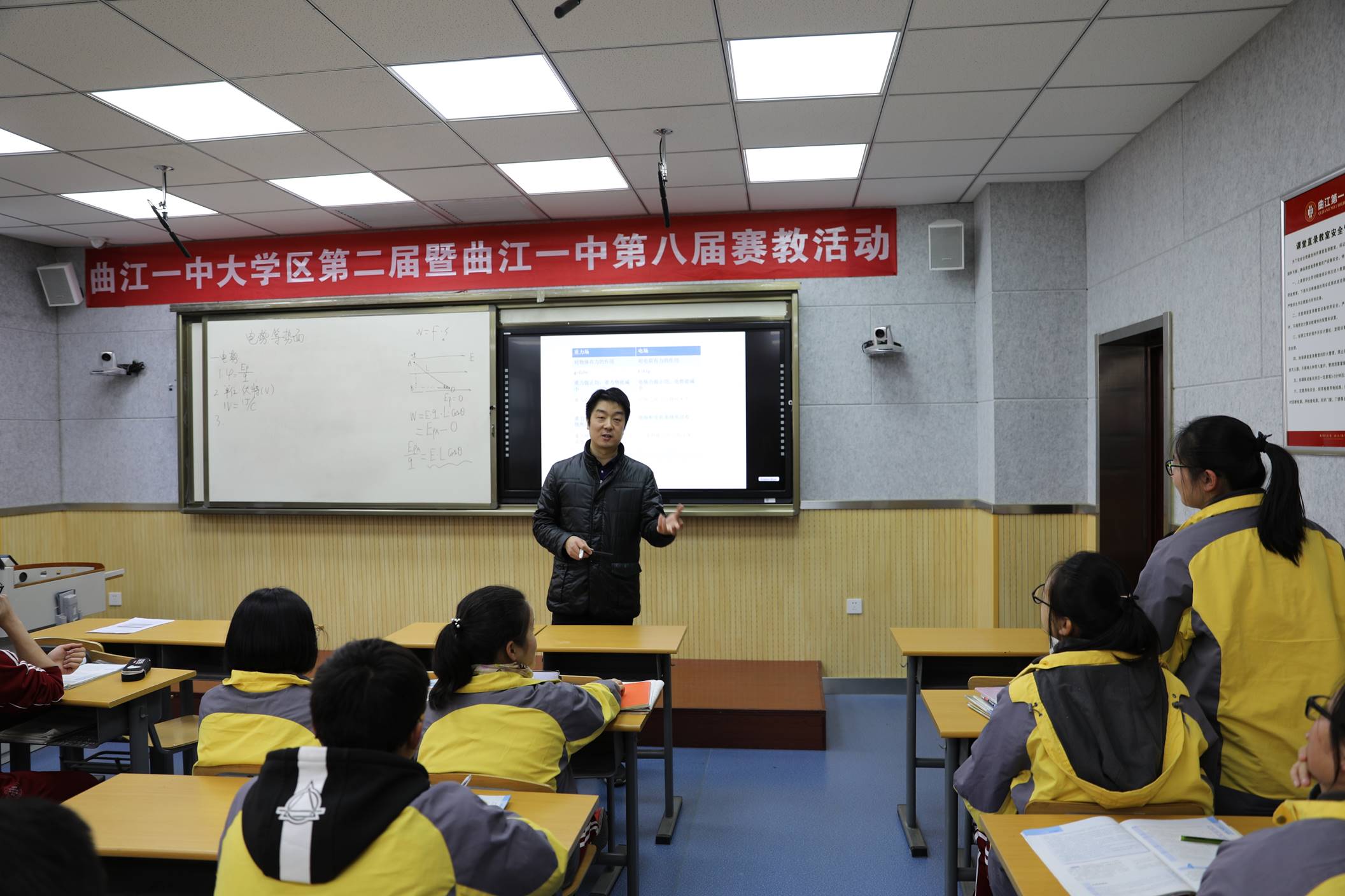 2017年12月19日,西安市曲江第一中学大学区第二届暨西安市曲江第一中学第八届赛教活动(高中理科组)精彩呈现。曲江一中数学吴晴雯、通用技术赵扬、体育林刚等8位老师参赛,雁塔区进校教研员马鑫、王涛、闫雪蕊、陕师大附中宋喜贵、学校副校长朱琳瑛、教务处主任刘公潜等担任本次赛教活动评委。