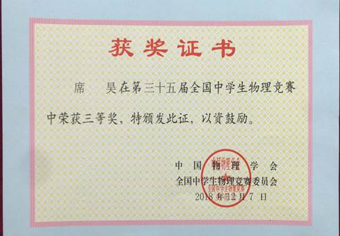 )班席昊同学获得省级三等奖。指导教师于静。特向该同学和指导老师表示祝贺!
