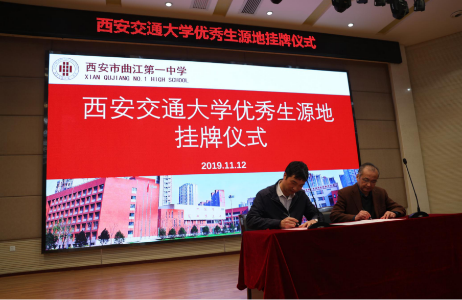 授牌仪式上,西安交通大学招生办公室副主任吴梦秋代表西交大招生办宣读了《关于西安交通大学授予西安市曲江第一中学优秀生源基地的决定》,称赞西安市曲江第一中学输送的学子学业功底扎实、思维方式创新、心理素质健康,希望两校与时俱进,继往开来,共同为国家培养年轻有为的杰出青年。吴梦秋副主任与刘公潜主任代表双方学校签署了优秀生源基地建设协议书,之后,为我校授予“优秀生源基地”牌匾。