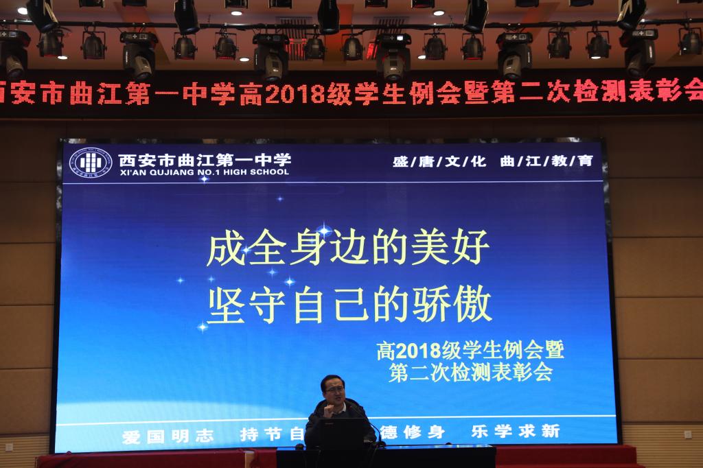 2019年1月4日,西安市曲江第一中学高2018级学生例会暨第二次检测表彰会在学校润德厅举行,高2018级全体师生参加了此次表彰会,会议由年级组长董锋老师主持。