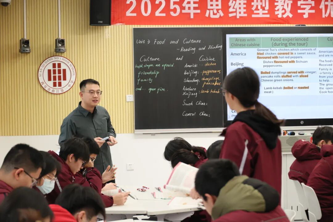 西安市曲江第一中学教师柳一迪以教材单元封面图片——“贵州千人长桌宴”为切入点,巧妙导入课程主题,并通过在课堂中持续引导学生思考,最终与单元主旨形成深刻呼应,完成了一次立意深远、结构完整的主题教学。本节课的核心在于培养学生的高阶思维。柳老师不仅指导学生深度解读文本、梳理逻辑结构,更着重引导他们探寻现象背后的“因果关系”。在读后拓展环节,他巧妙借助AI技术,带领学生探究“西安美食为何丰富多样”这一主题,将历史、地理与文化因素融入语言学习,生动展示了跨学科融合的魅力,有效提升了学生的深度分析与批判性思考能力。