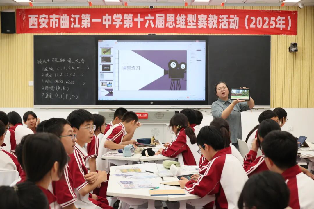美术教师张梦玥以个人vlog为情境导入,结合学生自身的生活经验,引导他们思考如何优化“一镜到底”的影视语言,进而引出本节课的课题,为传统美育课堂注入了全新活力。张老师通过对比小象埃德蒙和建筑大师贝聿铭的作品,引导学生分析并理解电影剪辑技术“蒙太奇”的概念,带领学生观察不同的剪辑方法,总结出“蒙太奇”的手法规律,帮助学生突破思维局限,探索多元艺术风格,拓宽审美视野。在课堂练习环节中,学生通过小组合作的方式,以学校的主建筑和风景为素材,创作了时长30秒以内的短视频,并通过共享的方式在大屏幕上展示。张老师通过技术赋能,层层递进,让美术课堂变得生动鲜活、高效多元,不仅提升了学生的剪辑能力,更培养了他们的艺术素养。