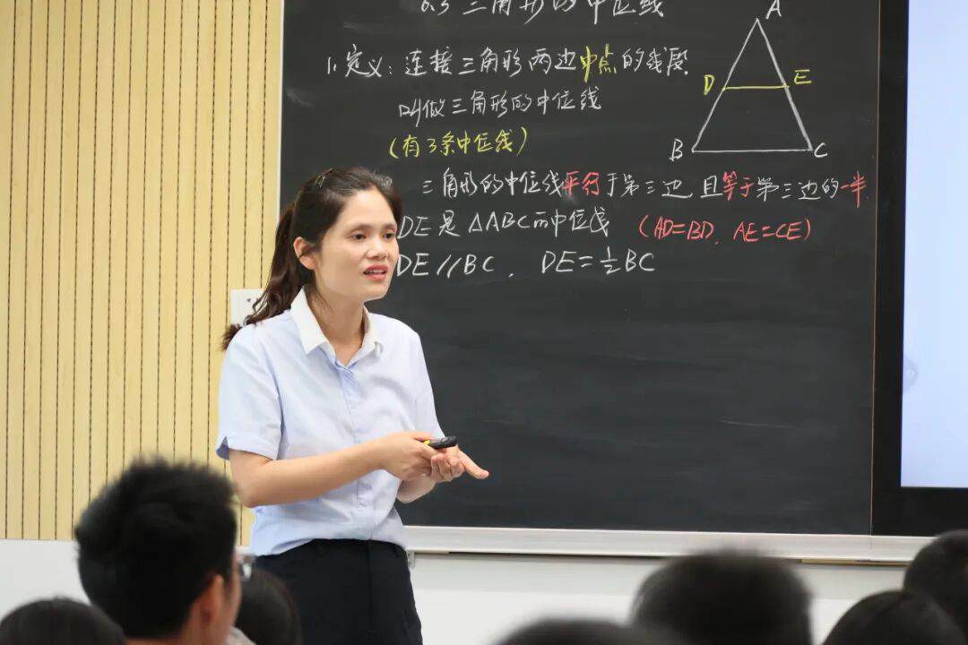周清波老师在《三角形的中位线》教学中,以实际案例导入课程,将数学概念与生活场景结合。周老师借助豆包学习平台提出创新解法,通过制造认知冲突,激发了学生的探究兴趣。课堂采用“猜想—验证—证明”的探究模式,借助动手操作、平板互动等实践活动,引导学生理解定理,提升学生的逻辑推理能力。同时,周老师借助问卷星实时采集学习数据,结合DeepSeek生成动态演示,有效提升课堂的直观性与反馈效率。