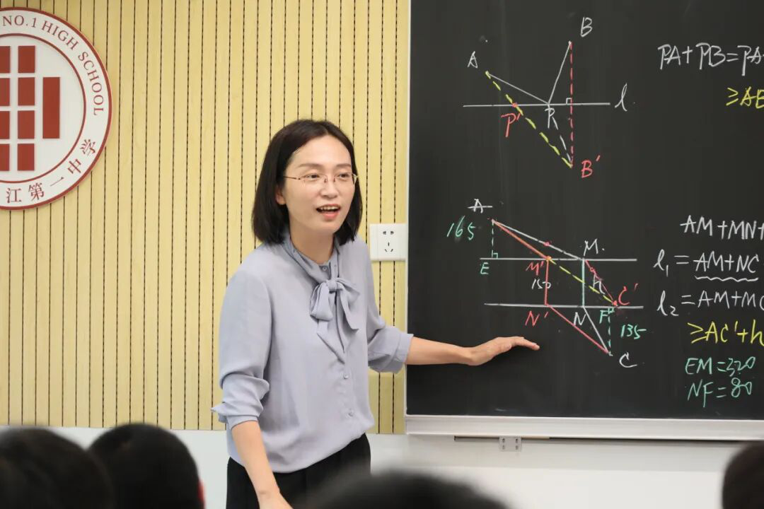 路莉娜老师在《最短路径问题》一课中,以乡村建设为背景创设情境,引出了“将军饮马”“造桥选址”“将军遛马”等经典数学问题。整堂课以“转化思想”作为核心脉络贯穿始终,通过设计层层深入的问题,引导学生思考,着重培养学生的抽象思维与数学建模能力。此外,她还巧妙地将AI技术融入教学过程,激发学生的探索欲望,让学生在感受科技魅力的同时,更好地感受到数学的应用价值。
