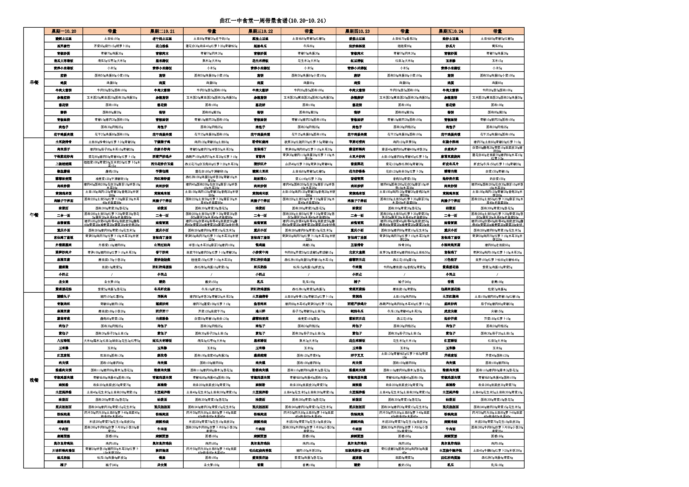 曲江一中食堂一周带量食谱(10.20-10.24)