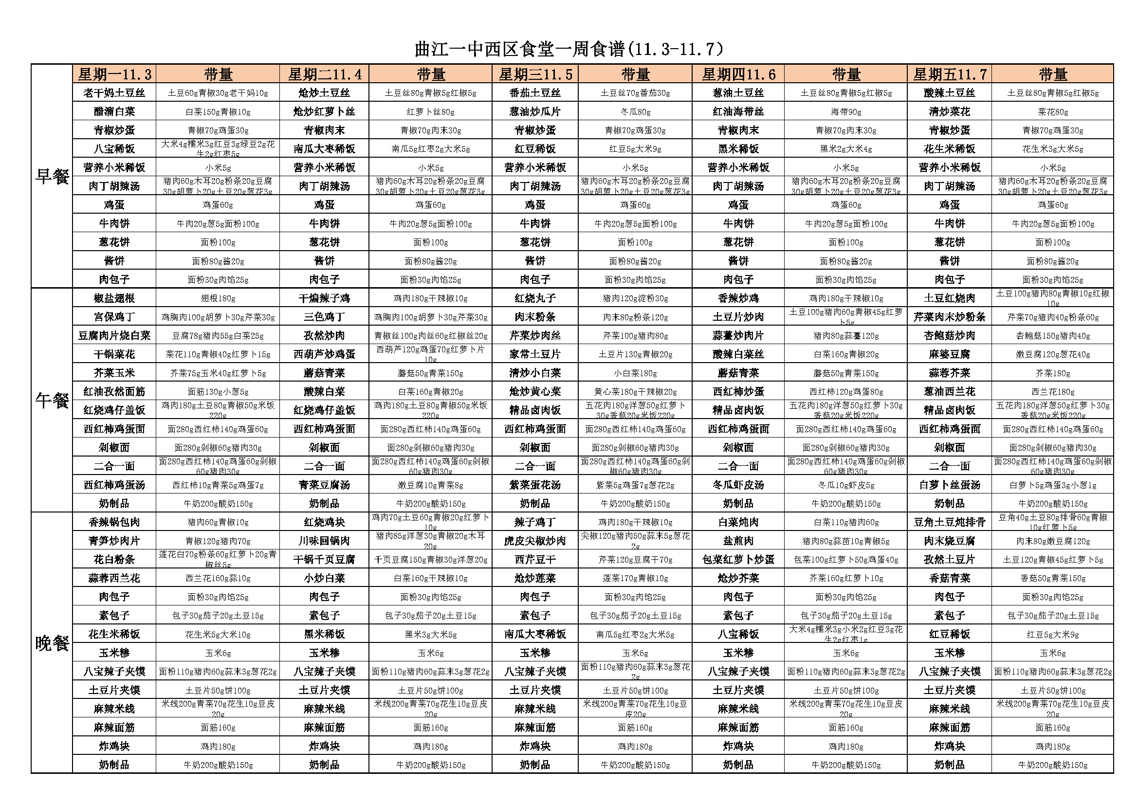 曲江一中食堂一周带量食谱(11.3-11.7)