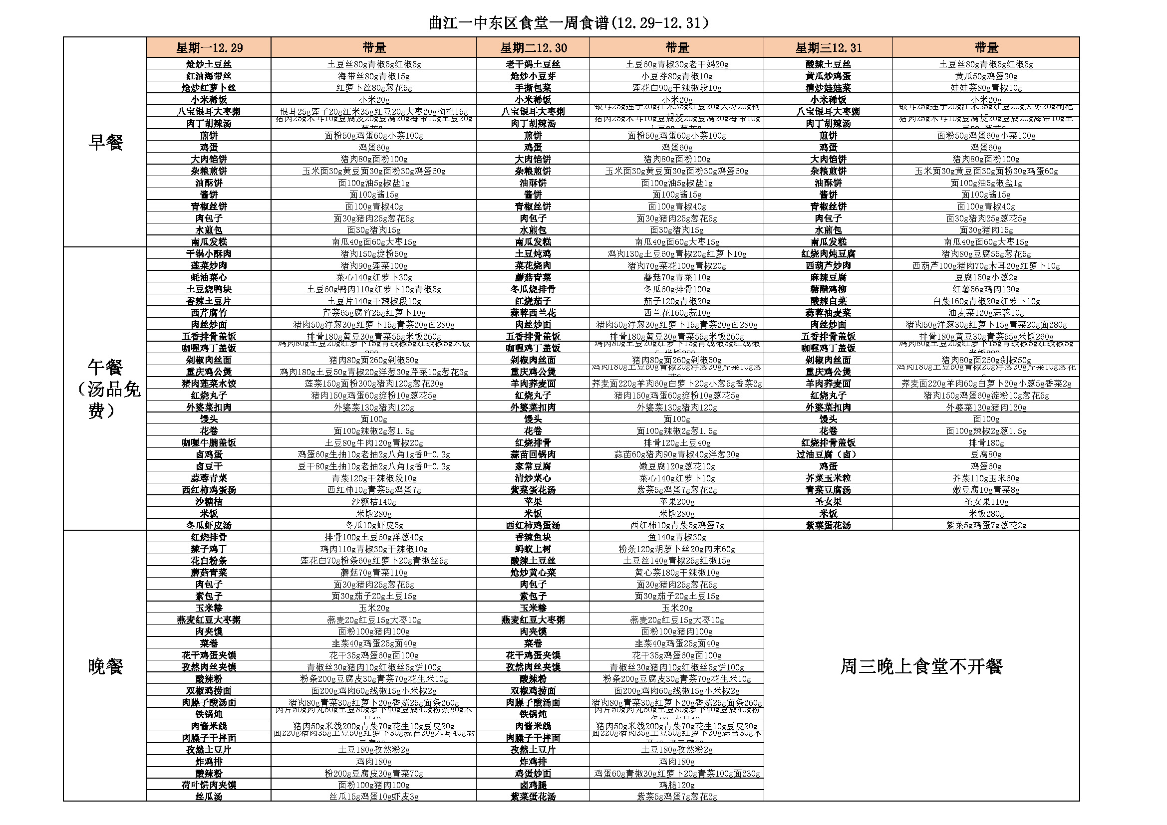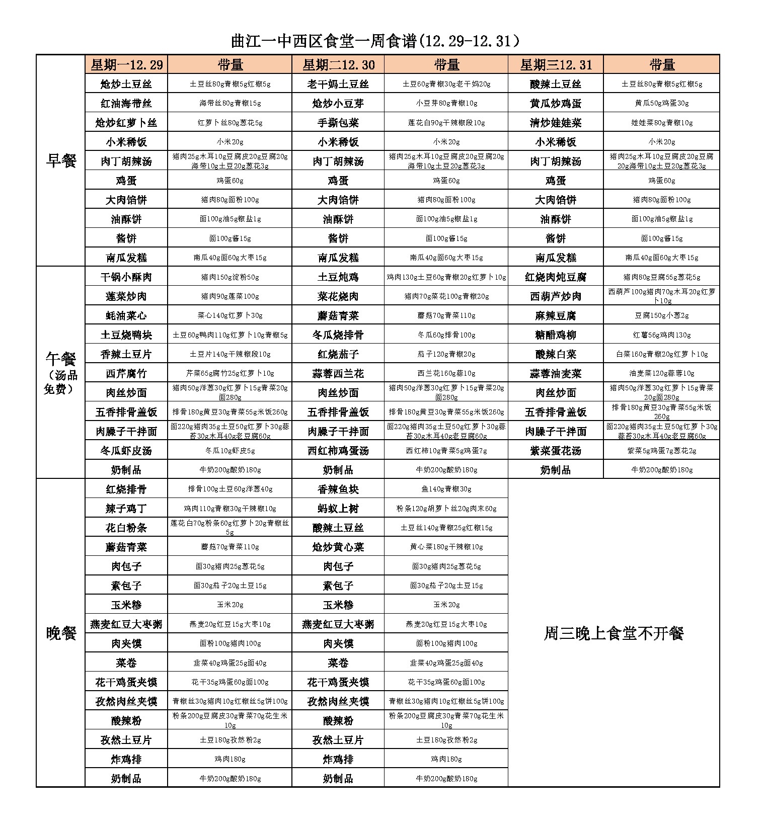曲江一中食堂一周带量食谱(12.29-12.31)