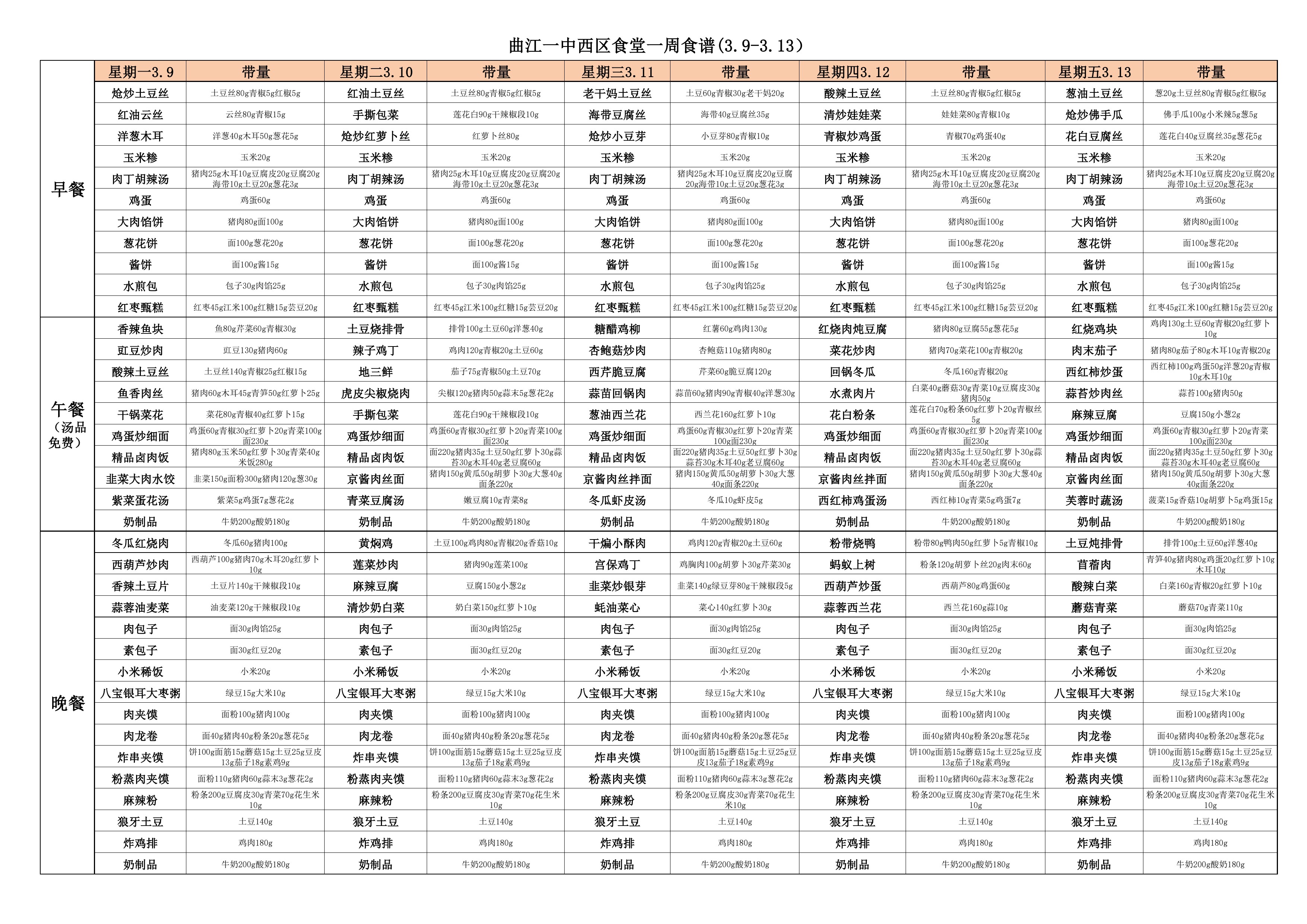 曲江一中食堂一周带量食谱(3.9-3.13)